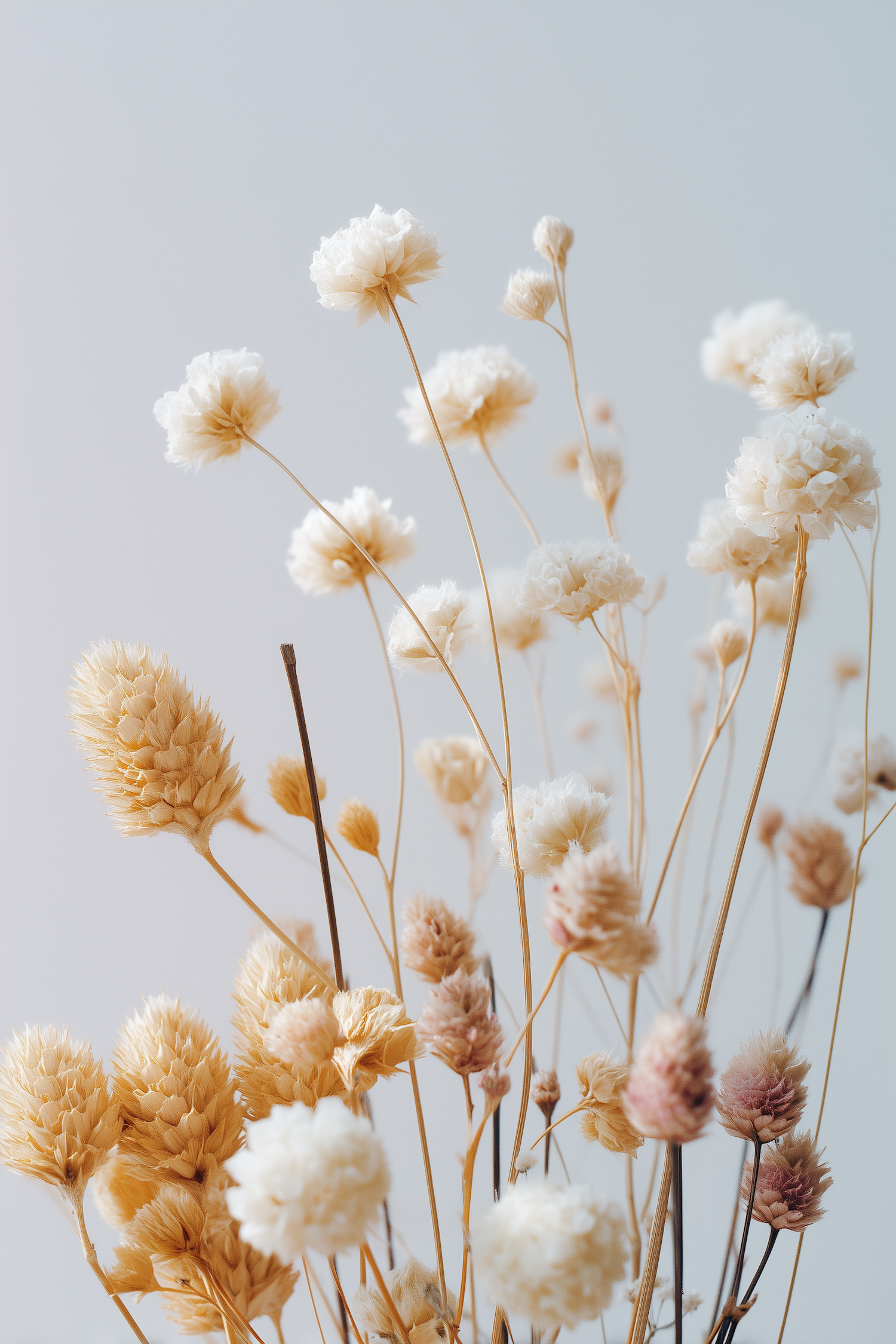 Minimalist dried flower arrangement with white blooms and golden seed heads against a soft blue background. Perfect for serene decor.