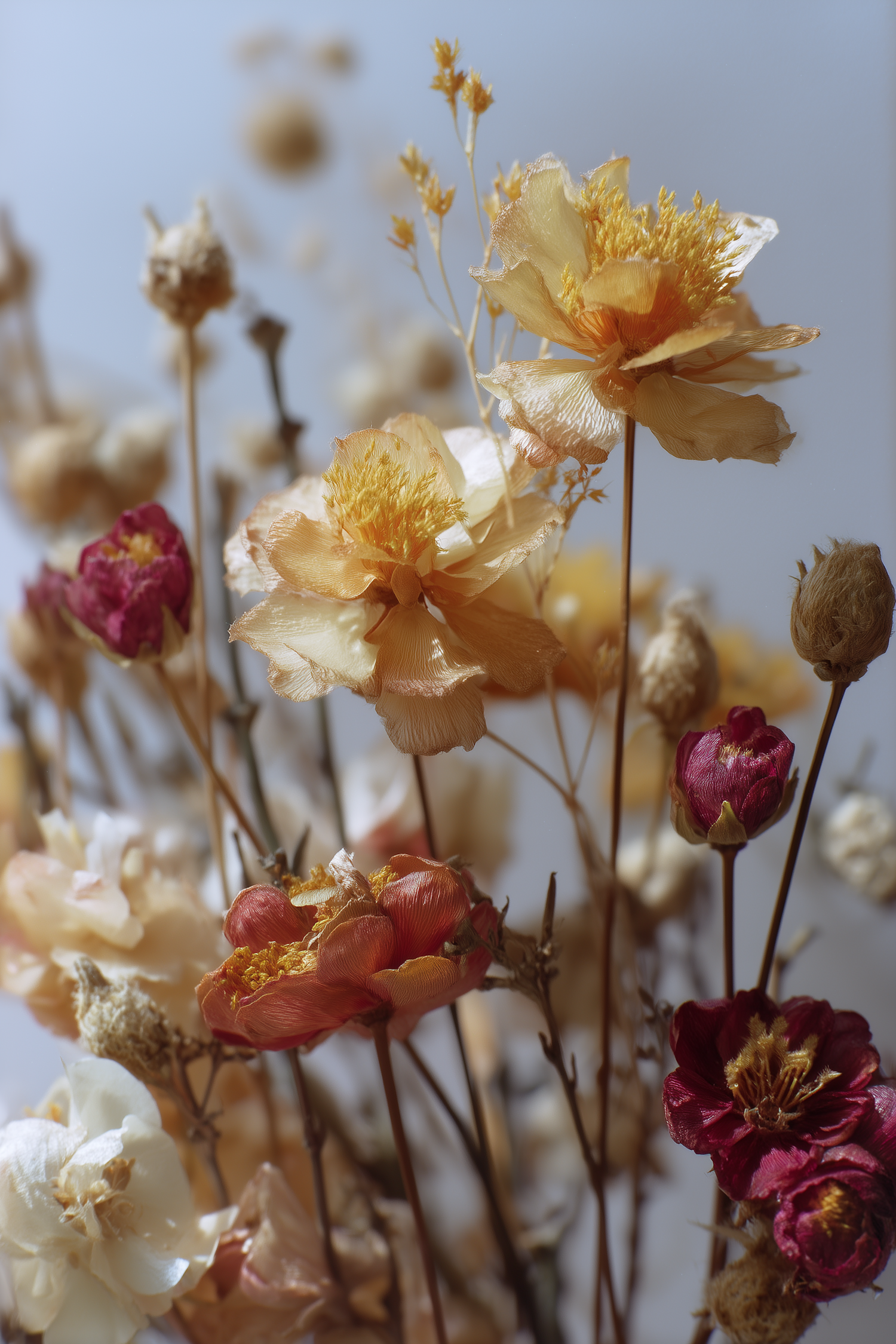 A stunning close-up of dried flowers in warm tones, featuring golden, red, and orange hues with intricate textures and soft natural lighting.