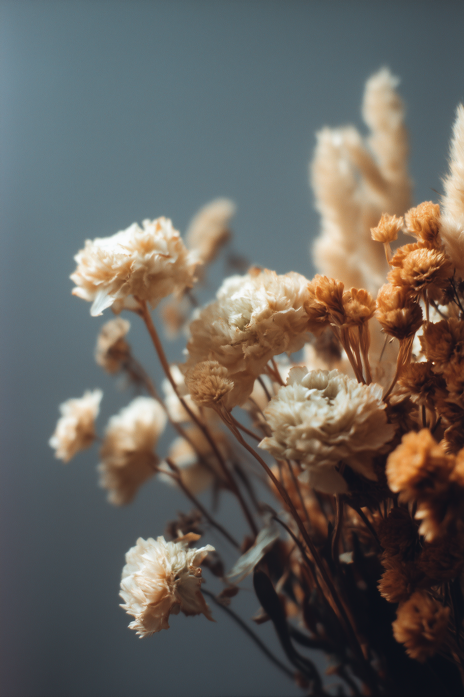 A serene close-up of dried flowers in warm tones against a muted blue-gray background, perfect for minimalist and rustic aesthetics.