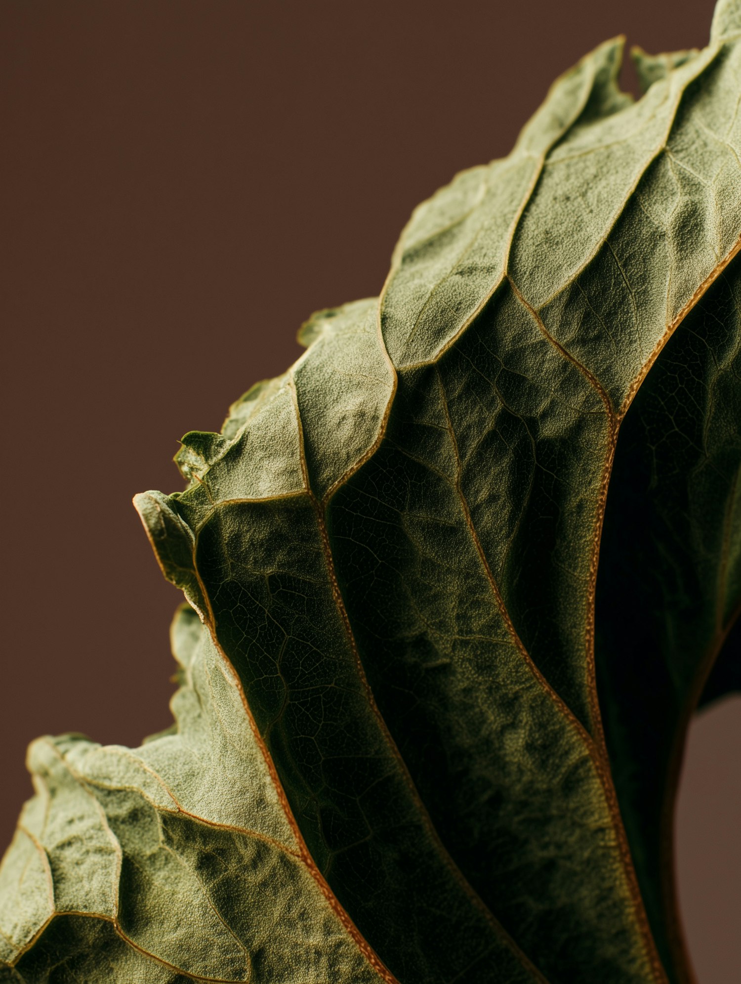 Close-up of a dried leaf with detailed veins and texture, set against a plain brown background, emphasizing its natural beauty.
