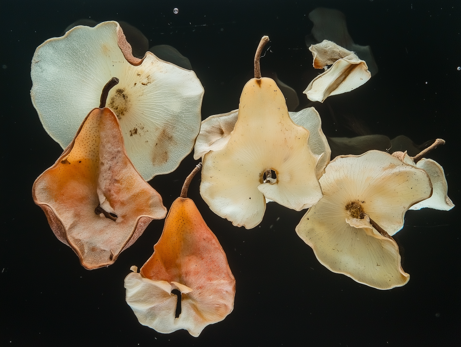 Artistic arrangement of dried pear slices on a dark background, showcasing natural textures and colors.