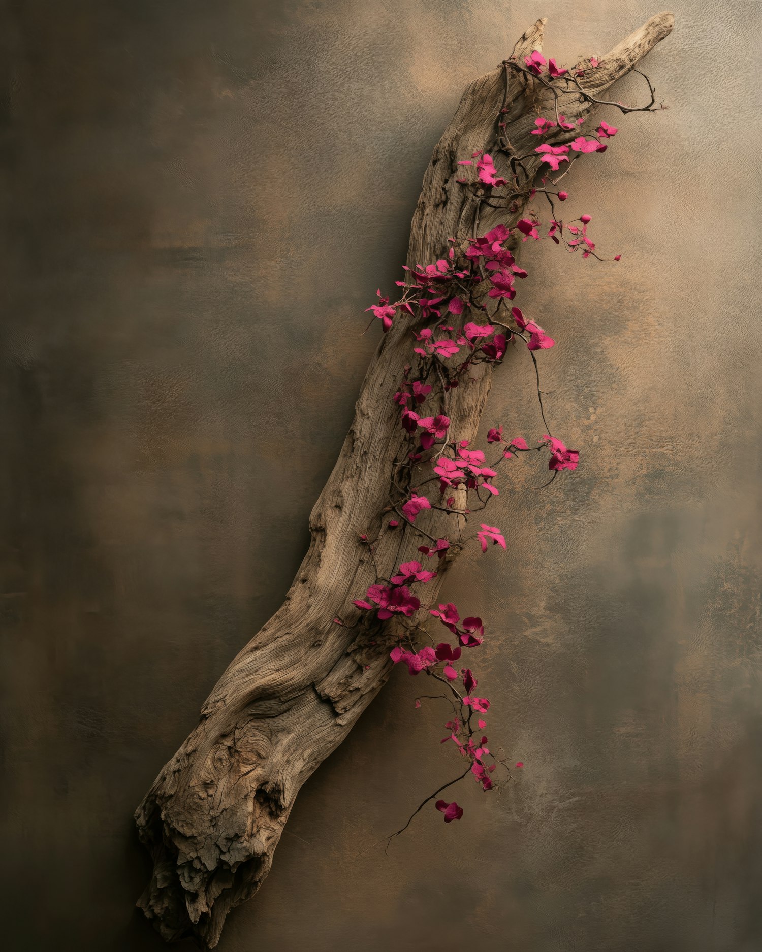 Rustic driftwood adorned with vibrant magenta flowers against a textured earthy wall, creating a minimalistic and artistic natural display.