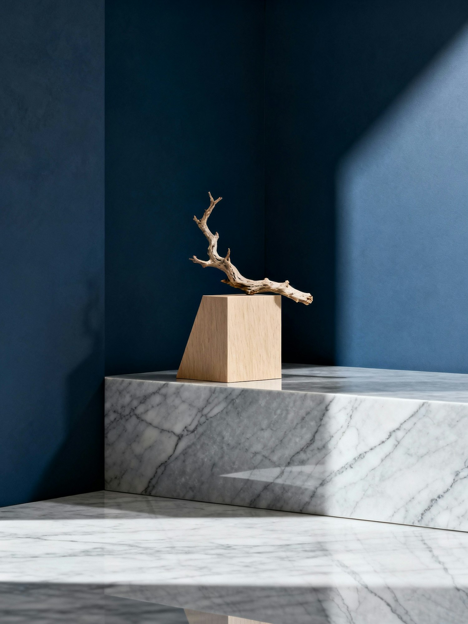 Minimalist decor with a wooden pedestal, driftwood sculpture, and marble base against a deep blue wall, bathed in natural light.