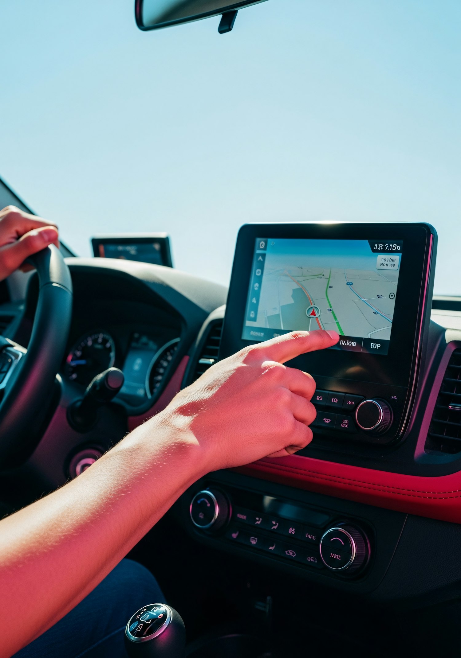 A driver interacts with a car's touchscreen navigation system, showcasing modern dashboard design and a clear blue sky outside.