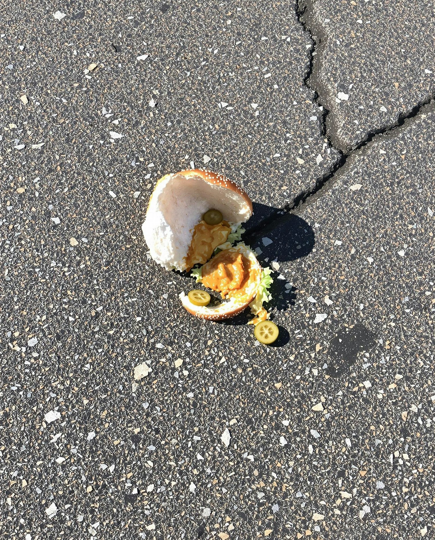 A fallen burger, open-faced on a cracked asphalt road, showcasing its contents of cheese, lettuce, and a single jalapeno slice.