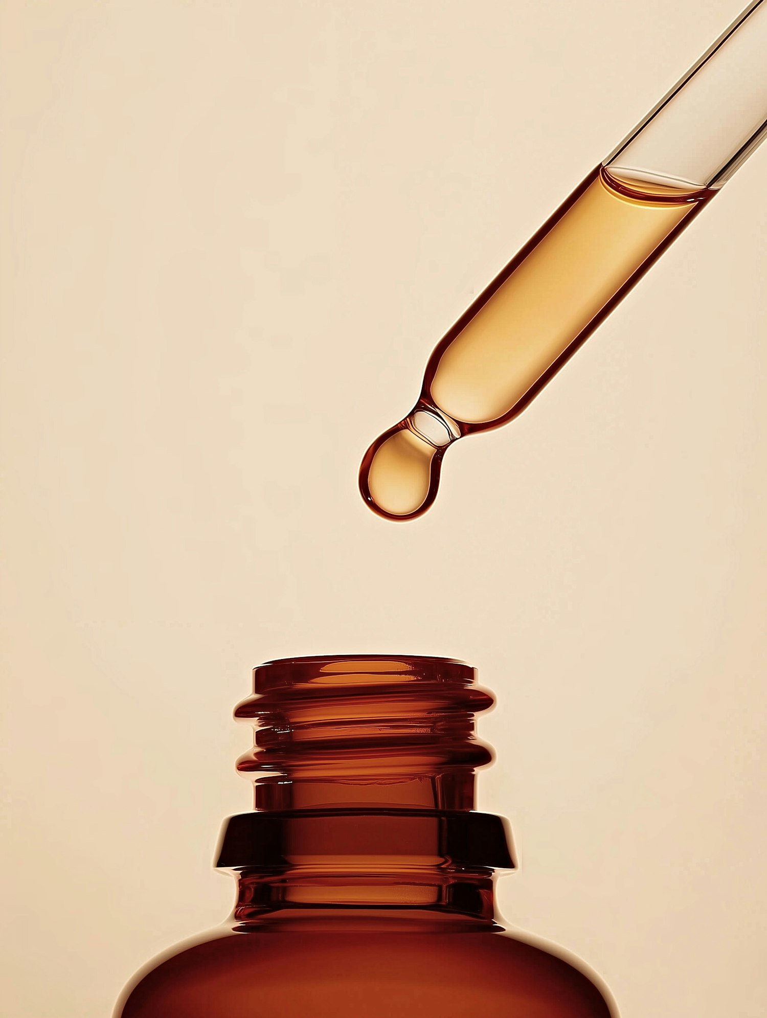 Close-up of a brown glass dropper bottle with a pipette releasing a drop of liquid. Minimalistic and warm aesthetic.