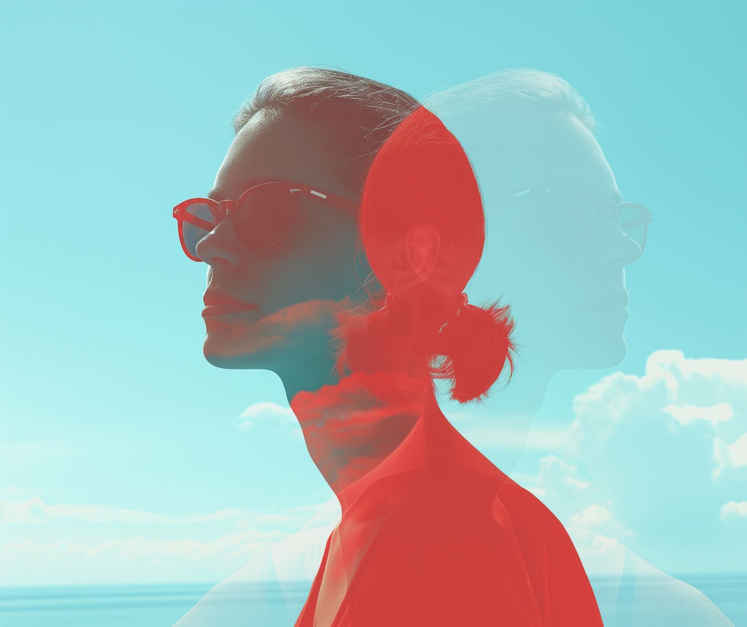 Double exposure of a woman in red sunglasses against a cyan sky, blending her profile with a red silhouette for an artistic effect.