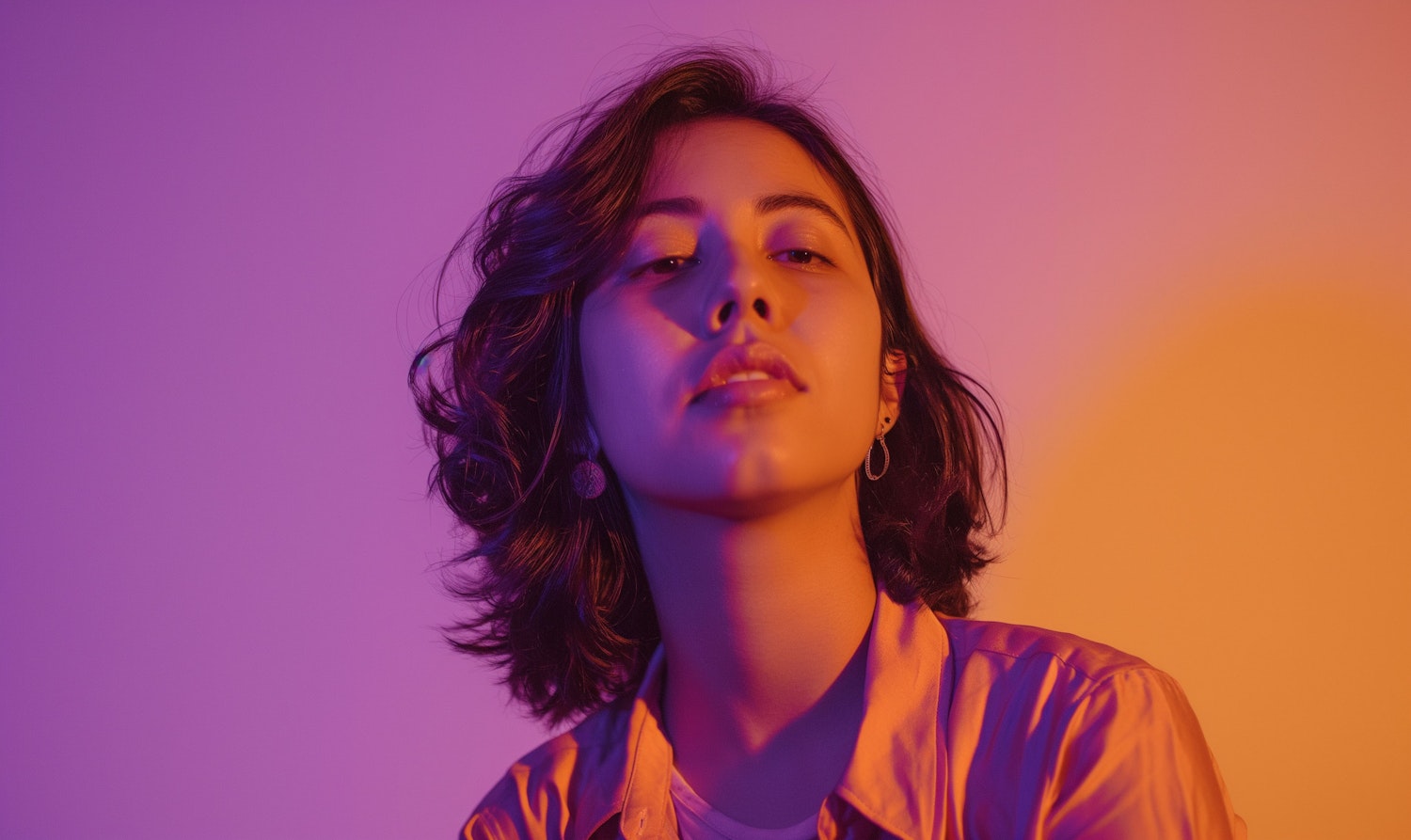 Portrait of a young Asian woman with wavy hair, highlighted by vibrant purple and orange lighting, creating a dramatic and artistic effect.