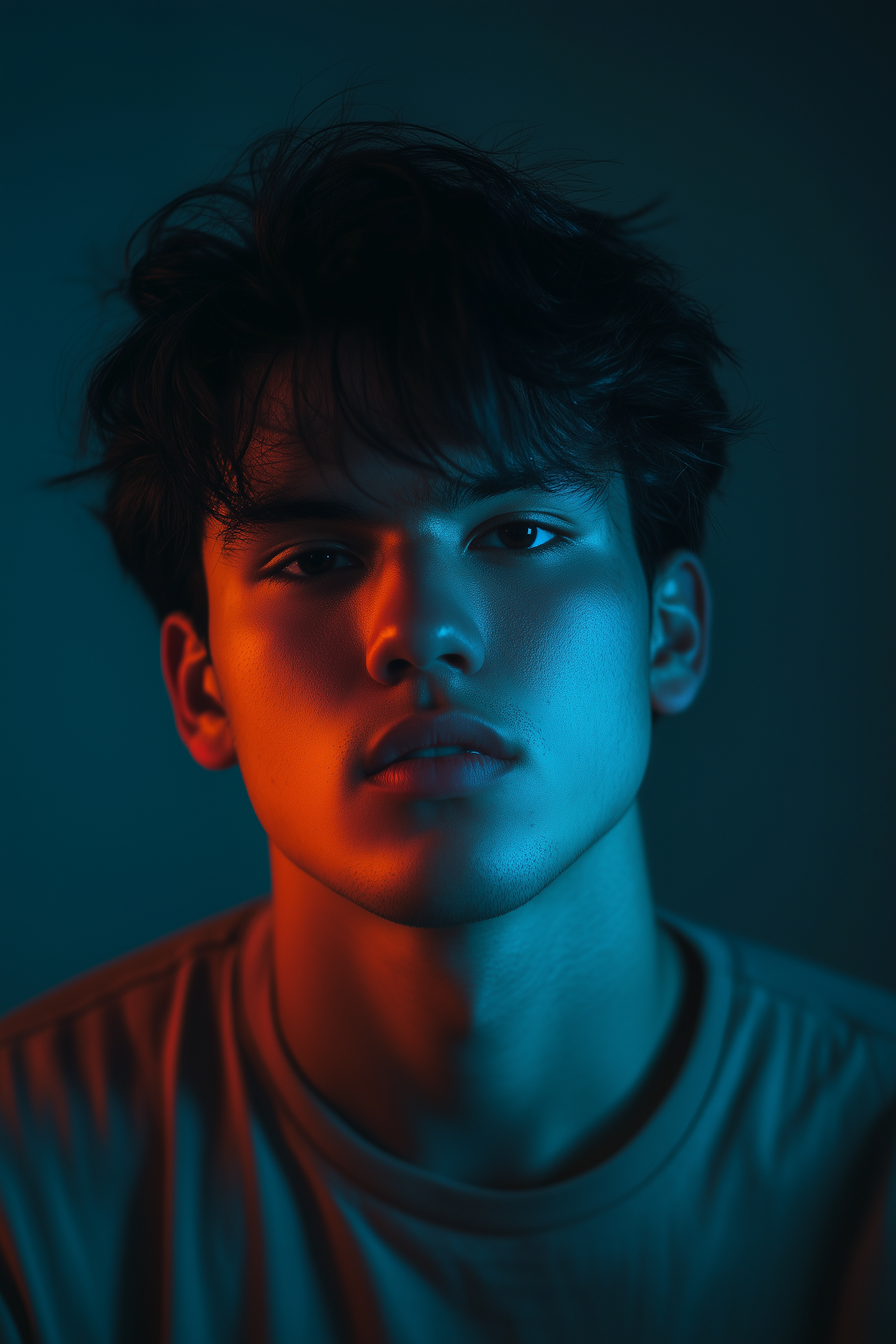 Dramatic portrait of a young man with blue and orange lighting, creating a striking visual contrast on his face.