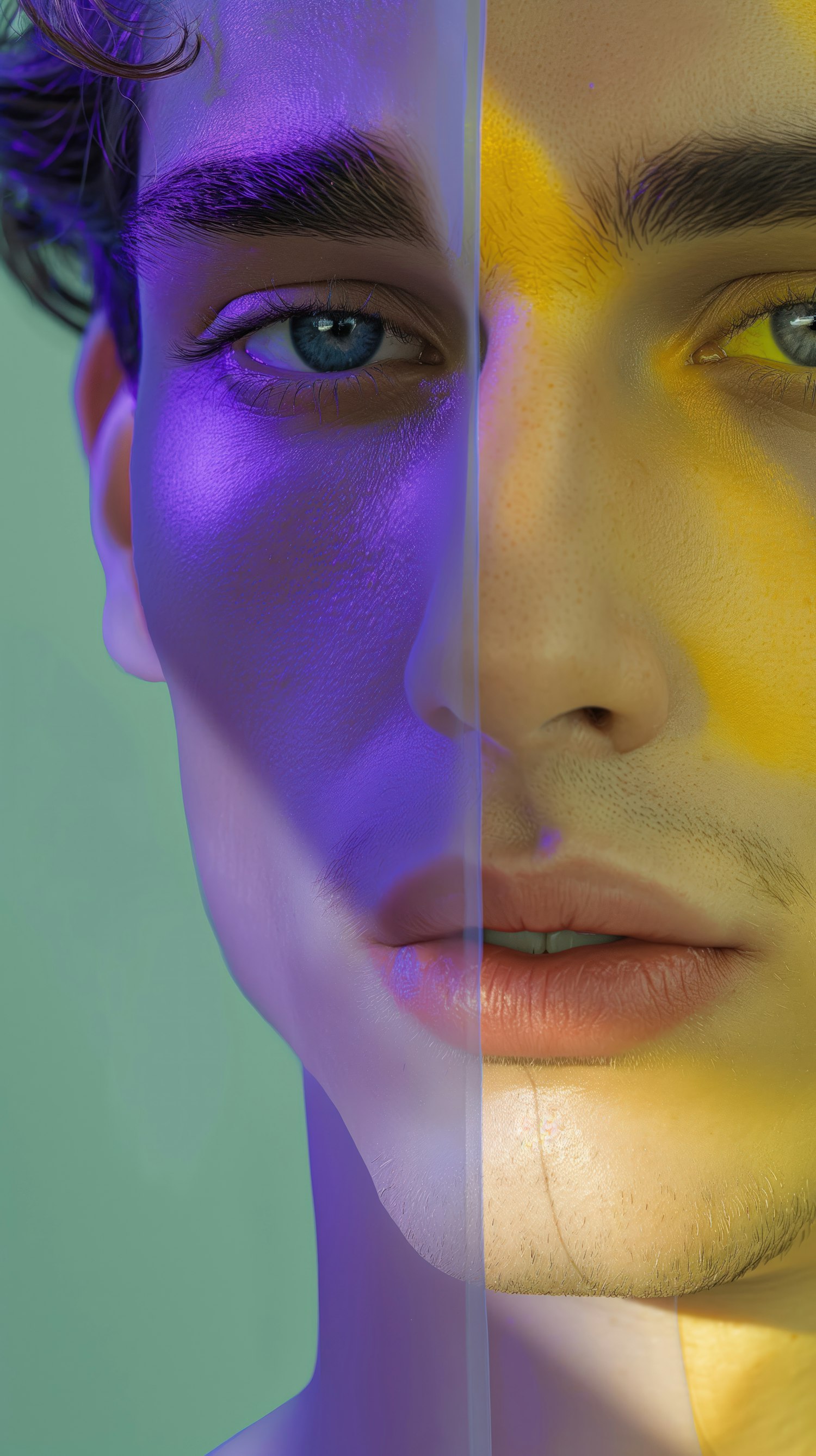 Blurred face with dark brown wavy hair, light skin tone, against a green and purple gradient background with warm lighting.