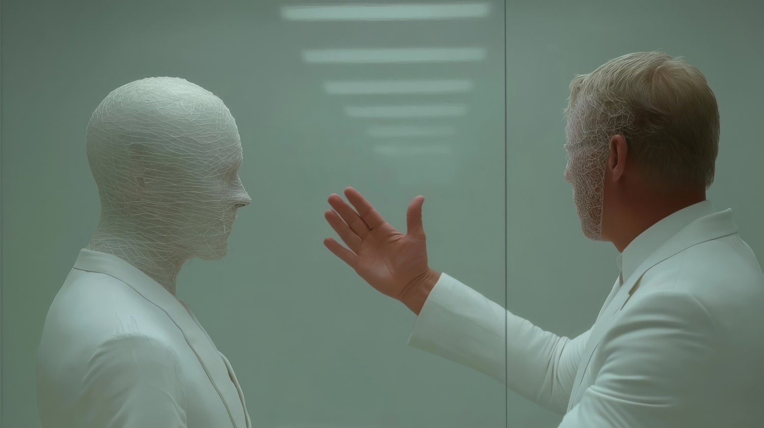 Two figures in white suits with web-like faces interact in a minimalist, futuristic setting with a soft green background.