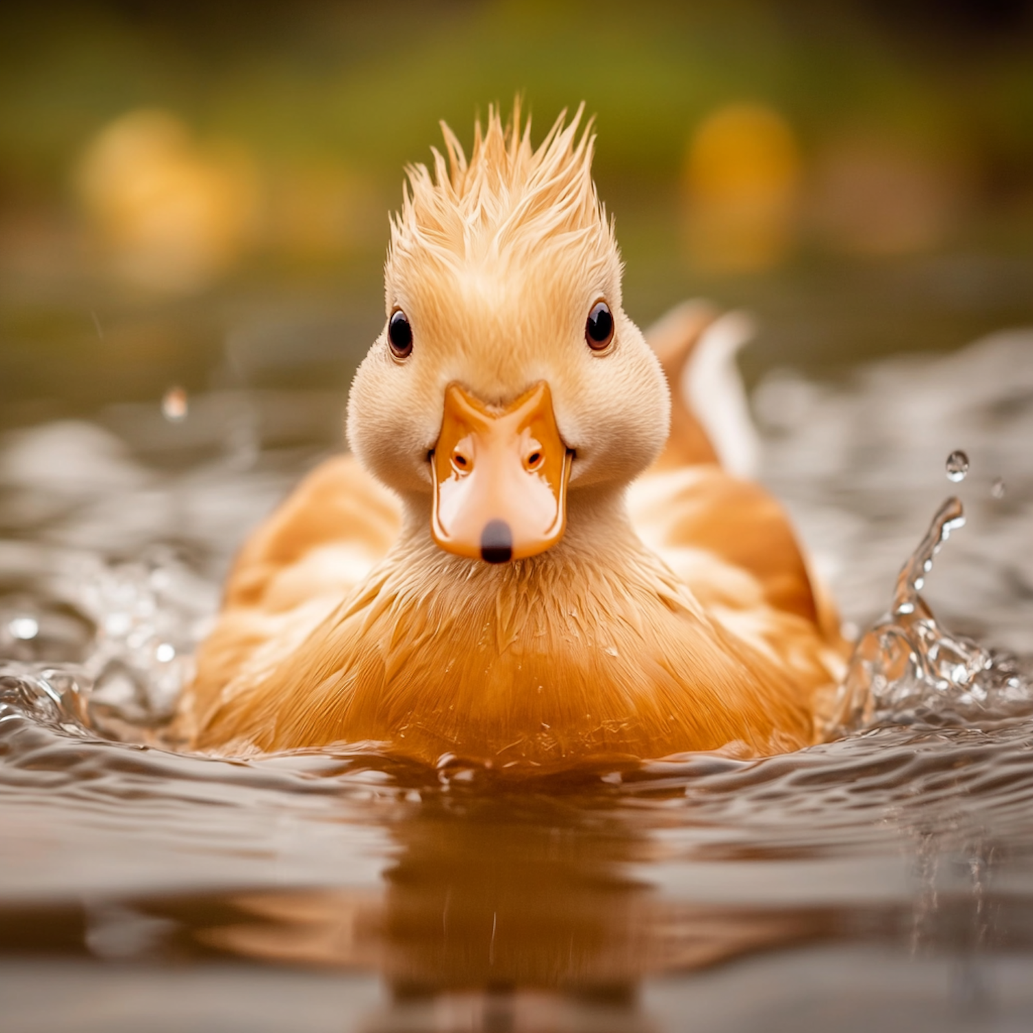 A vibrant orange and white duck glides on water, creating a lively splash. Its playful feathers and bright beak stand out beautifully.