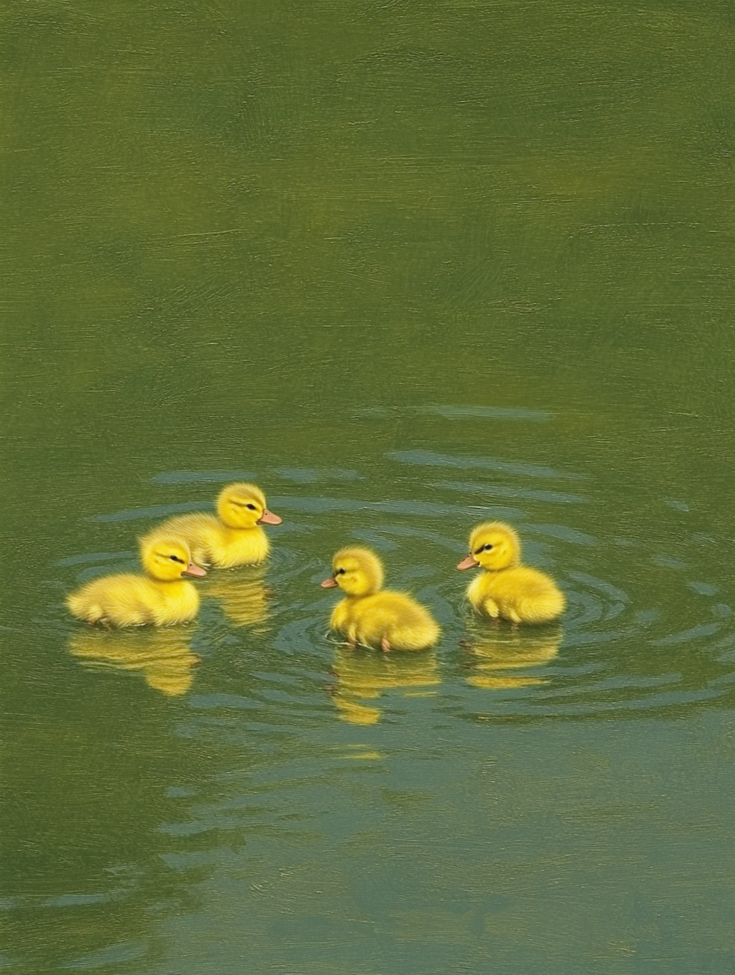 Four adorable yellow ducklings swimming on a tranquil green pond, creating gentle ripples in the water.