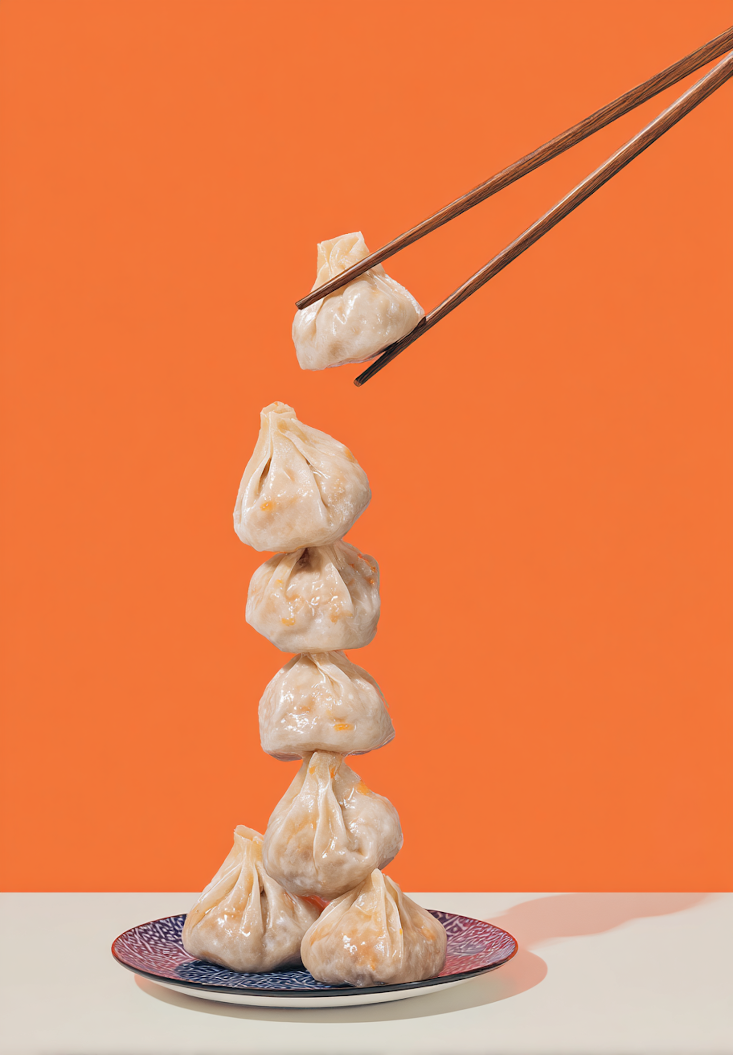 Delicious steamed dumplings stacked on a plate with a vibrant orange background, captured in a beautifully minimalist style.
