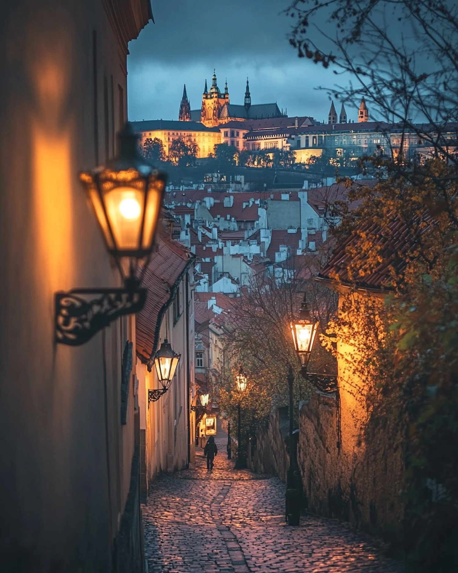 Charming cobblestone street with glowing lamps leading to a majestic castle under a dusky sky, evoking a serene European evening.