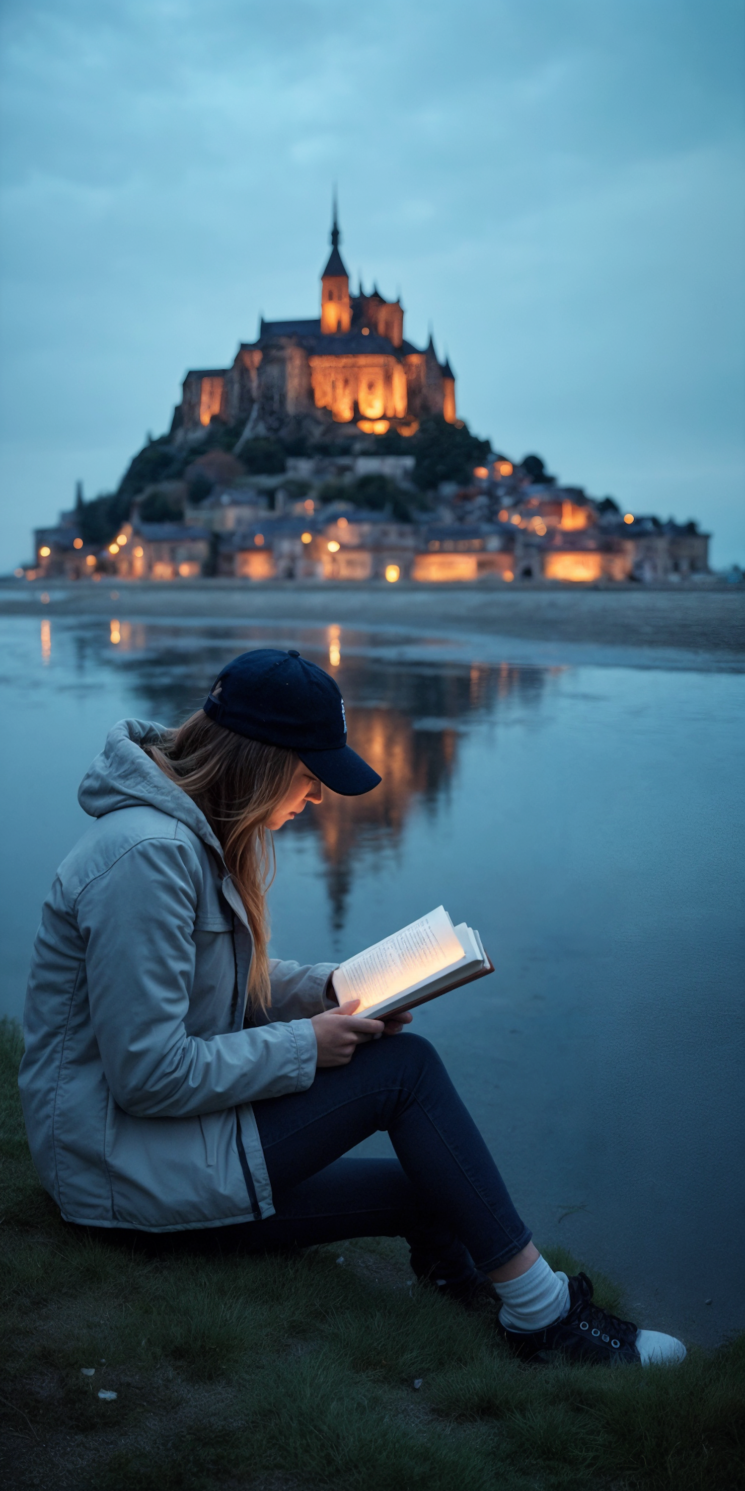 A woman reads a glowing book by a reflective lake at dusk, with a beautifully lit castle in the background.
