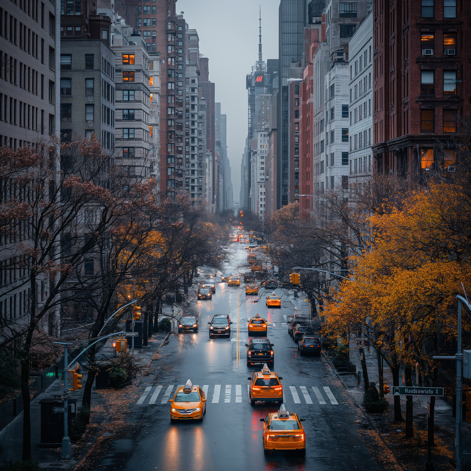 Vibrant city street with yellow taxis, tall buildings, and autumn trees. Captures urban energy on a rainy day.