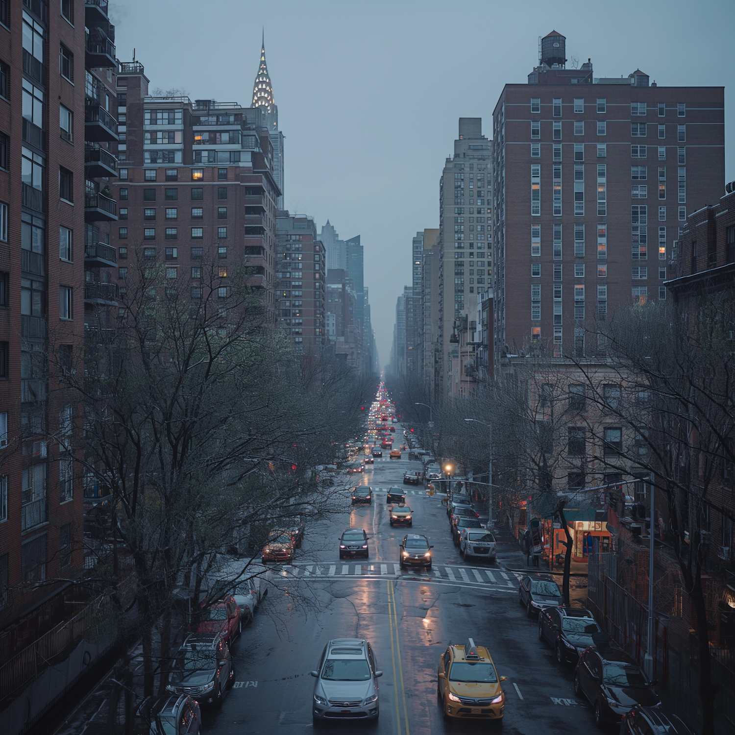 Gloomy city street with wet pavement, lined with cars and tall buildings, featuring a distant iconic skyscraper.