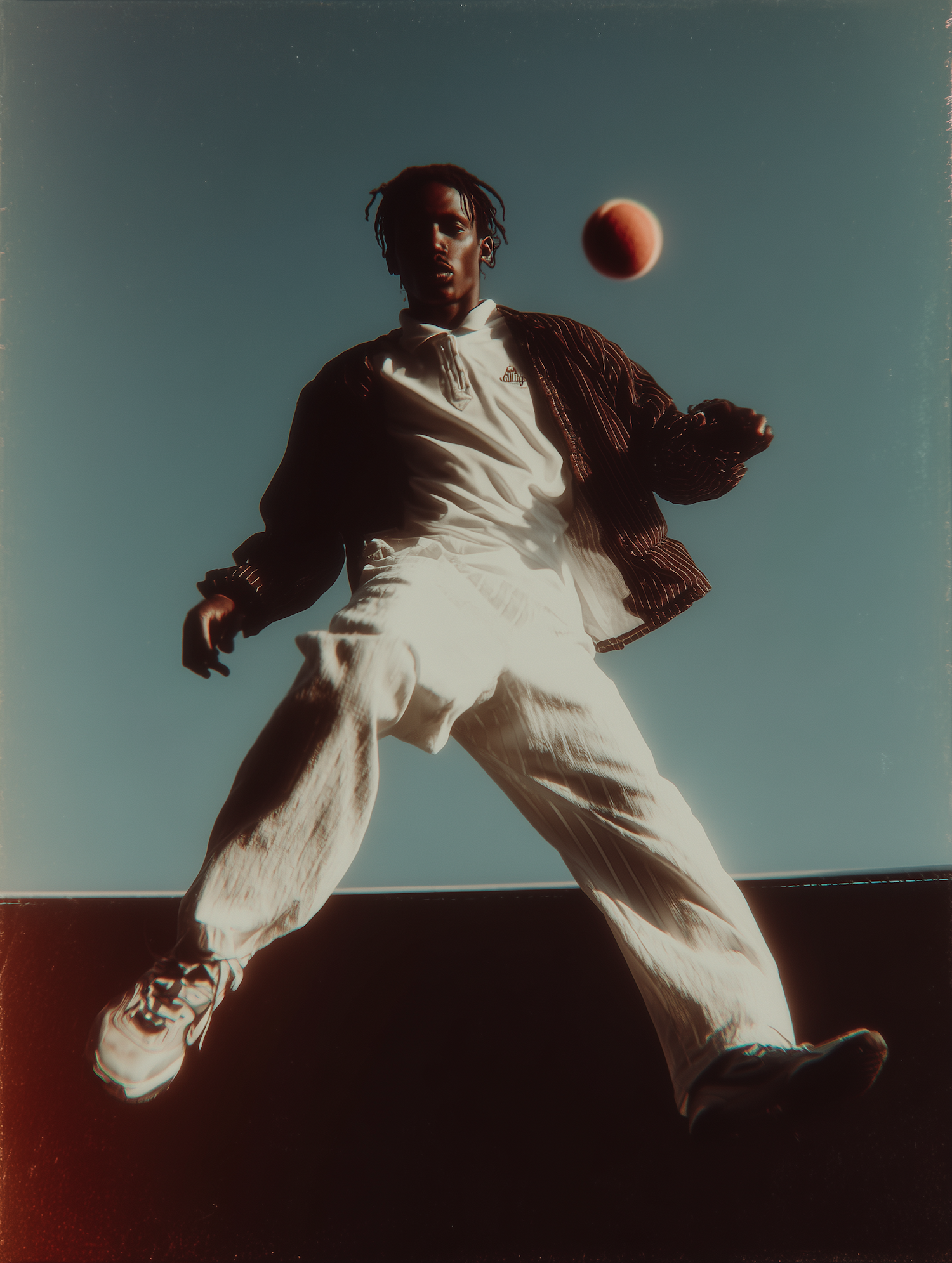 Dynamic low-angle shot of a man in motion with a ball in the air, set against a clear blue sky and warm lighting.