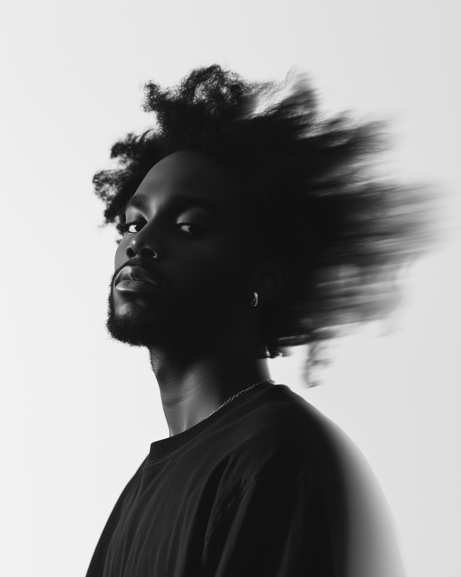 Black-and-white portrait of a man with an afro in motion, wearing a hoop earring and chain necklace, against a light gray background.