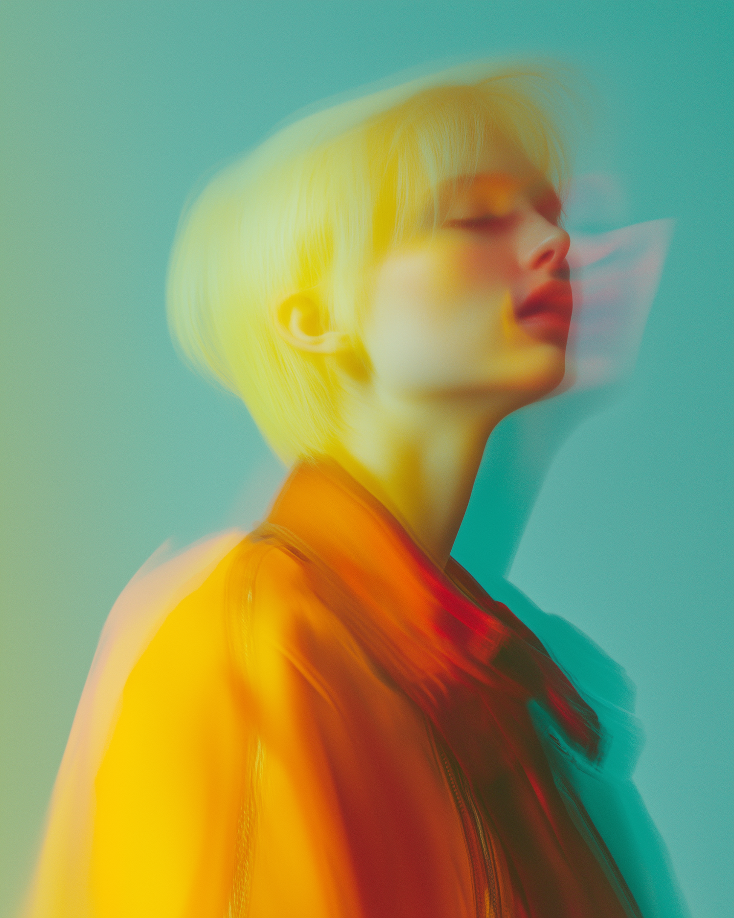 Abstract portrait with double exposure effect, featuring a person with yellow hair and orange jacket against a teal background.