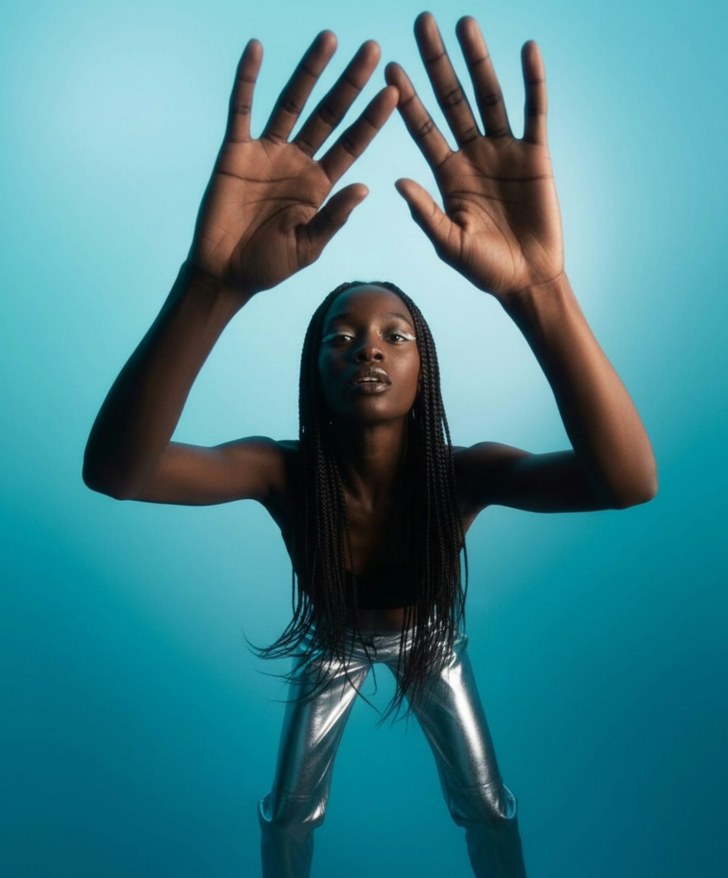 A striking portrait of a person in silver pants and a black top, posing dynamically with hands raised against a vibrant blue background.