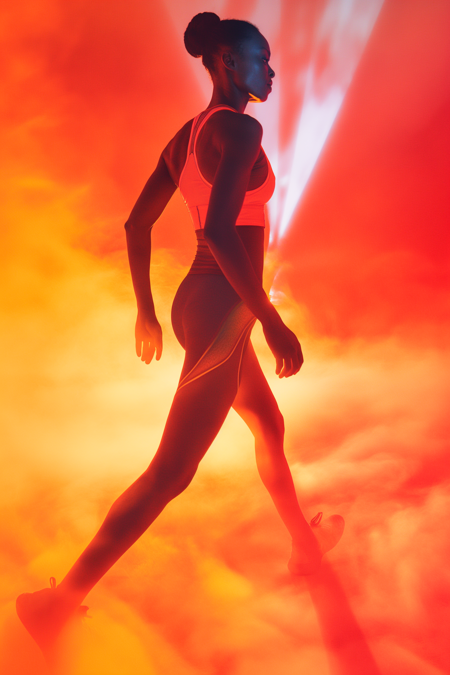 Dynamic image of a woman in motion against a fiery red and orange background, showcasing athleticism and energy.