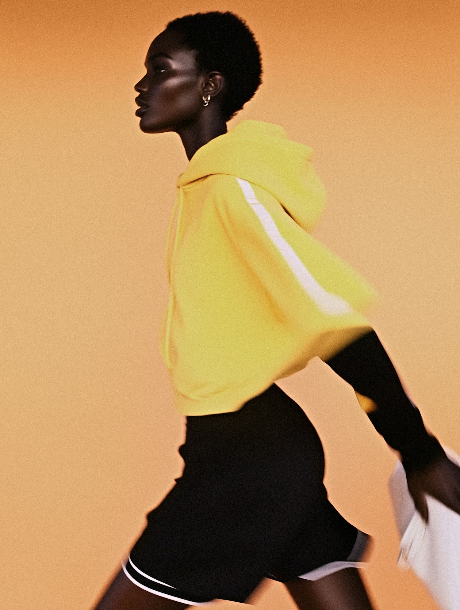 Dynamic shot of a woman in a yellow hoodie and black shorts, set against an orange background, showcasing modern athletic style.