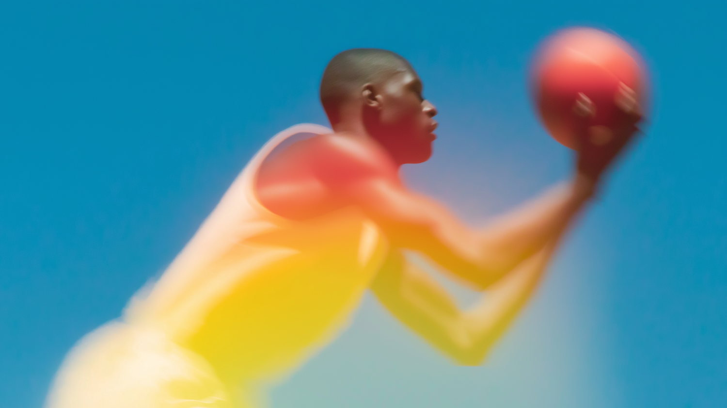 A vibrant, blurred image of a person playing basketball, emphasizing motion and energy against a bright blue sky.