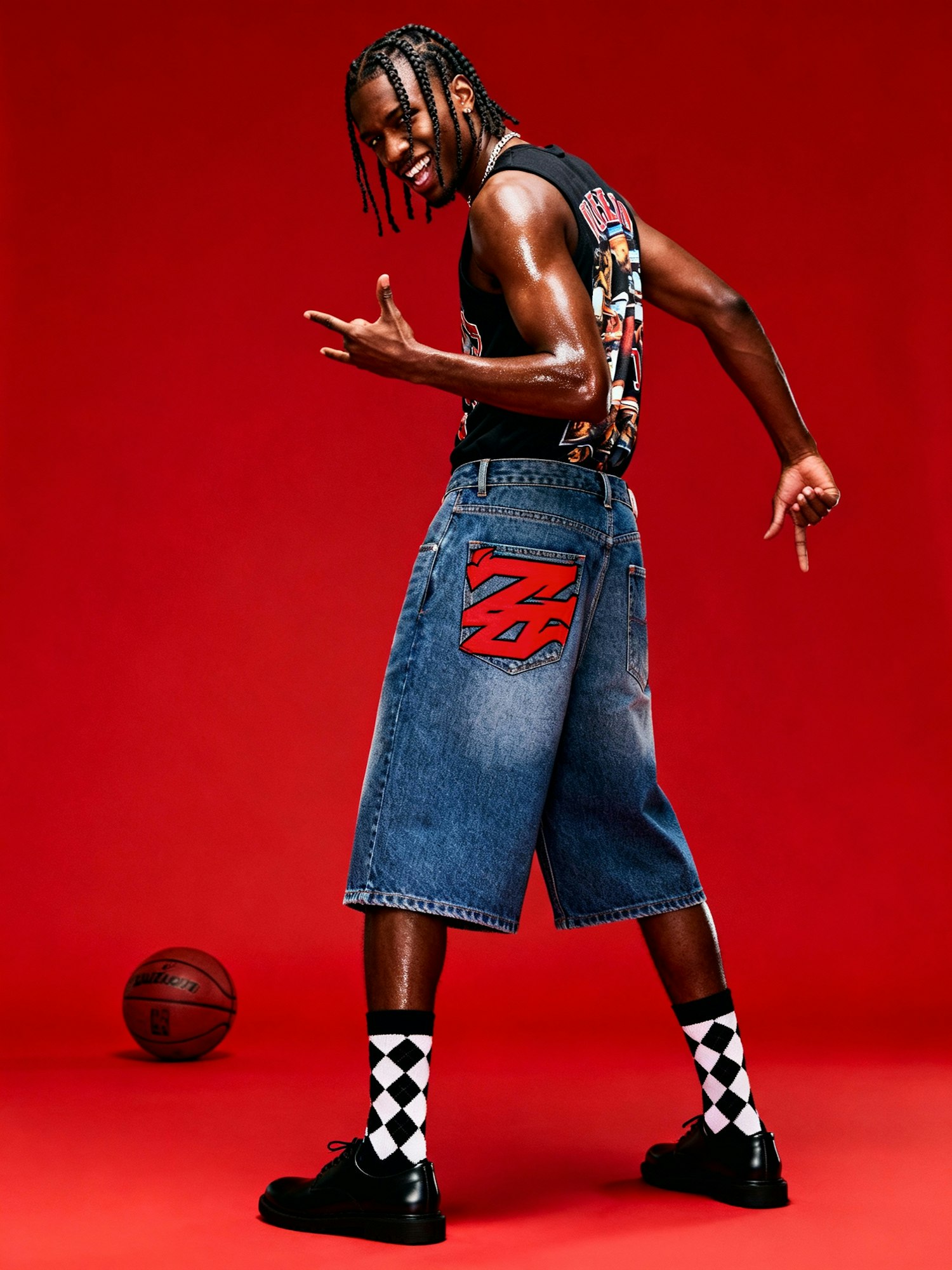 Stylish man in graphic denim shorts and argyle socks poses dynamically against a red background, with a basketball adding a sporty touch.
