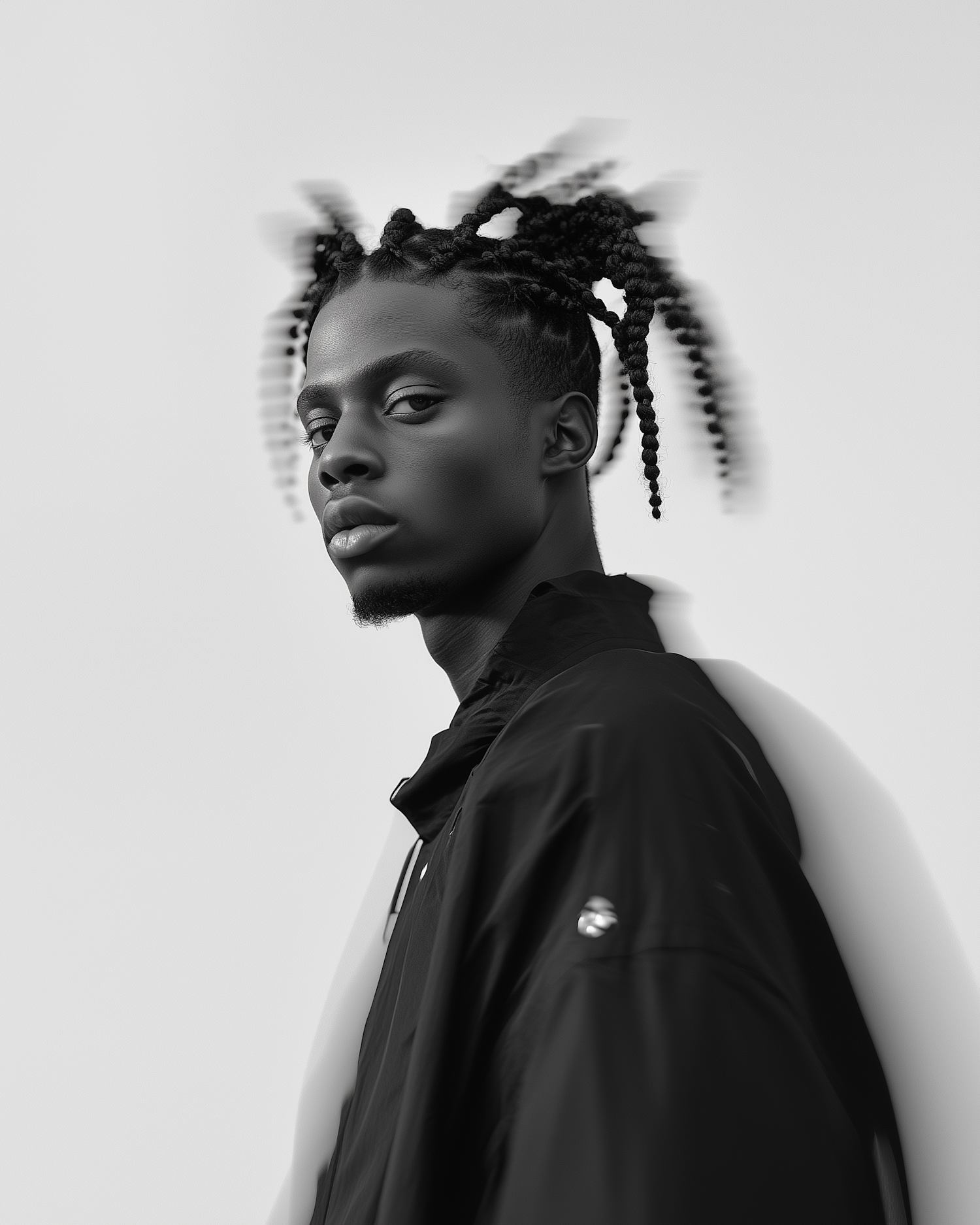 Monochromatic portrait of a young man with braided hair and a dark jacket, featuring a minimal background and artistic motion blur.