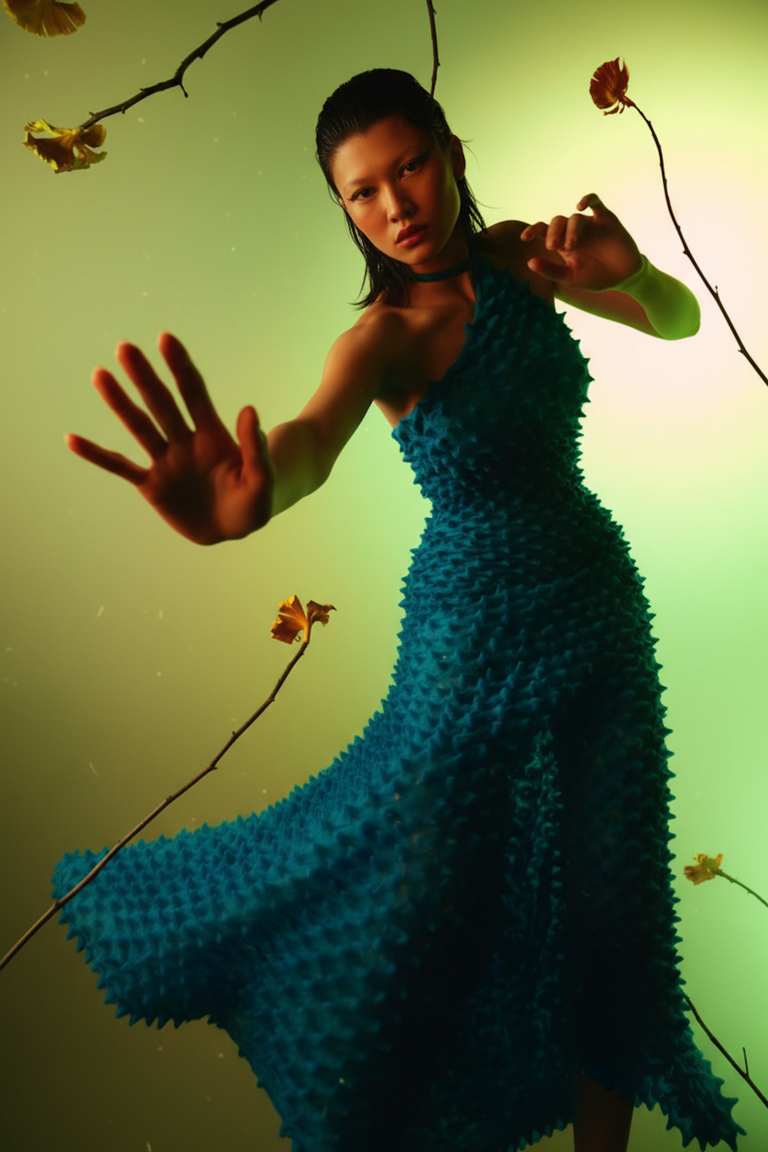 A person in a textured blue dress reaches forward against a green-yellow gradient background, framed by branches with yellow flowers.