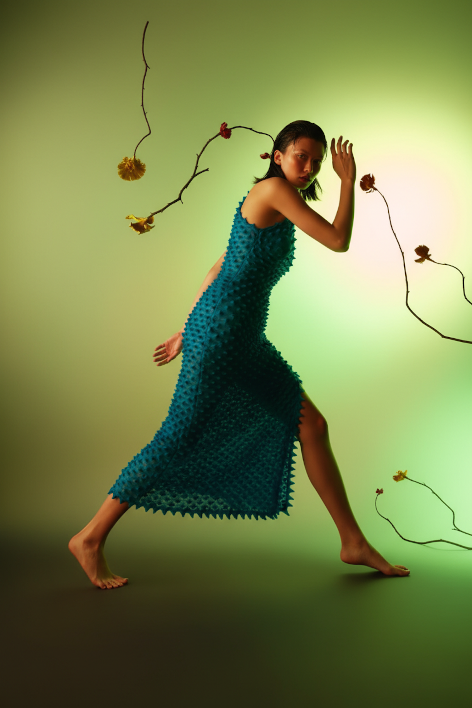 A person in a textured blue dress poses dynamically against a green background with branches and flowers, creating a modern artistic scene.