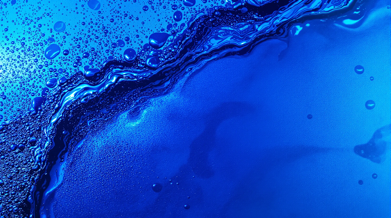 Abstract blue liquid texture with bubbles and ripples, creating a dynamic and glossy visual effect. Perfect for modern designs.