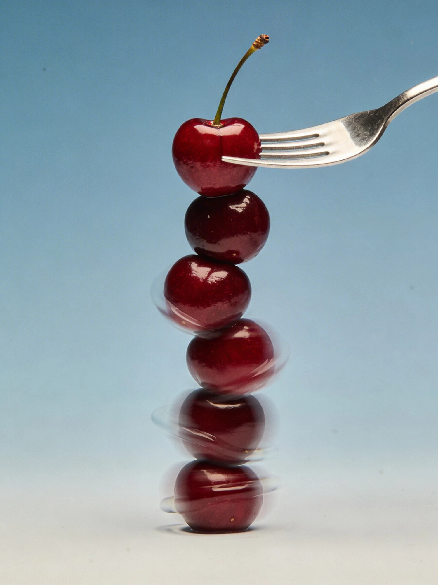 Hyper-realistic, professional food photography set against a desaturated sky-blue backdrop. A precision, perfectly vertical stack of cherries. Balanced impossibly at the peak is a single, perfect silver fork tine. A slight, gelatinous motion blur is evident, suggesting a momentary quiver. Dramatic, clinical overhead studio lighting. Shot on a vintage Hasselblad with Kodak Portra film grain. Minimalist and surreal.