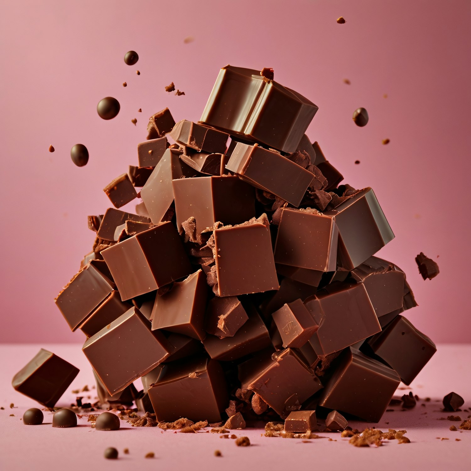A dynamic stack of glossy chocolate cubes with crumbs and floating spheres on a pink background, exuding indulgence and luxury.