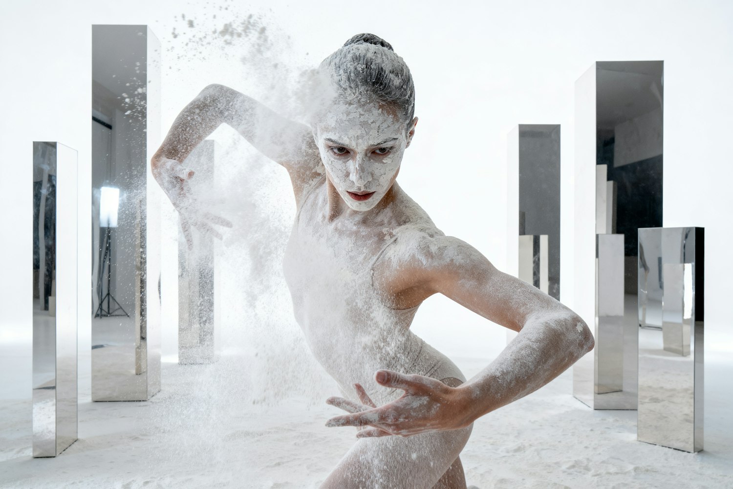 A dancer in motion, surrounded by white powder and reflective mirrors, creates a dynamic and artistic visual in a minimalistic setting.