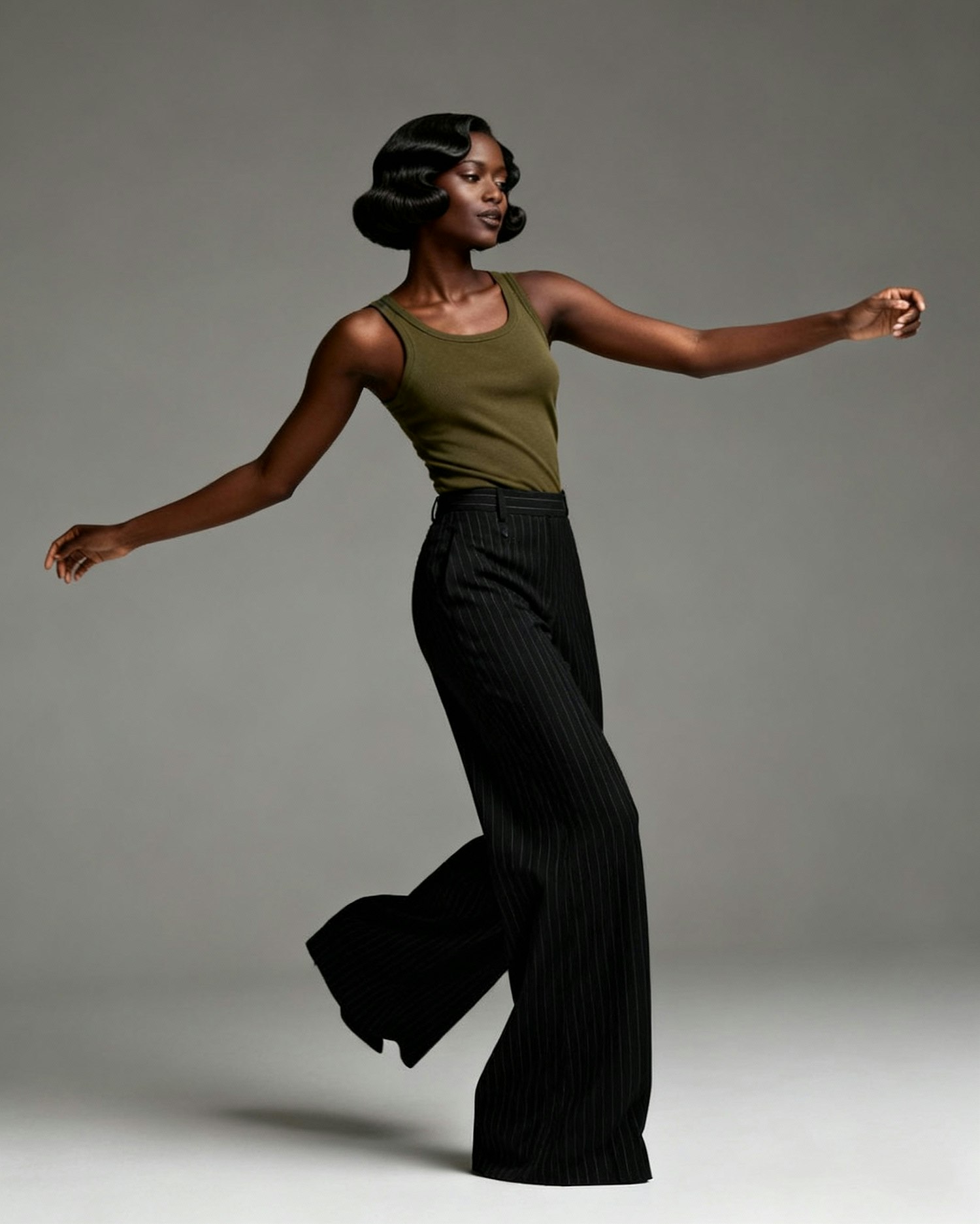 Full-body, ultra-high-definition portrait of a stylish Black woman standing confidently against a neutral gray background. She wears a tailored olive green tank top paired with wide-legged black pinstriped pants. Her body is angled in a dynamic pose—one arm extended, one leg bent—suggesting motion and creative energy. Her hair is styled in short finger waves, adding vintage elegance to her modern silhouette. The neutral gray background enhances the muted green tones of her outfit, making the layered textures and crisp pinstripes stand out. Lighting is soft and directional, casting sculptural highlights across her skin and garment. The overall mood is modern, modest, and editorially sharp—ideal for a Gen Z fashion portrait or Afro-fusion identity showcase that celebrates movement, contrast, and creative authority.