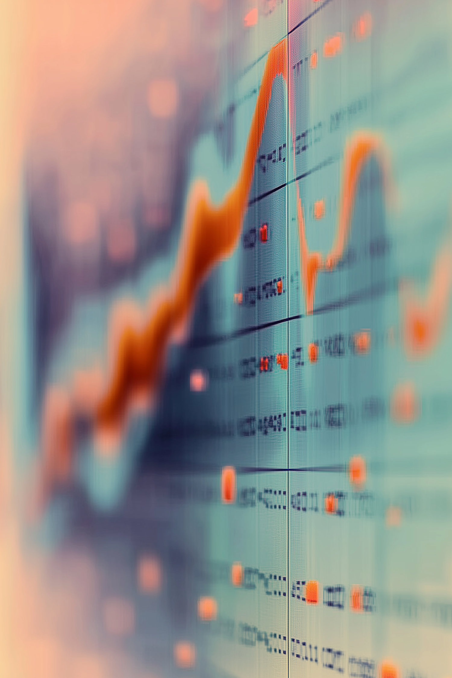 Abstract close-up of a financial chart with an orange line graph on a teal background, showcasing fluctuating trends and data points.