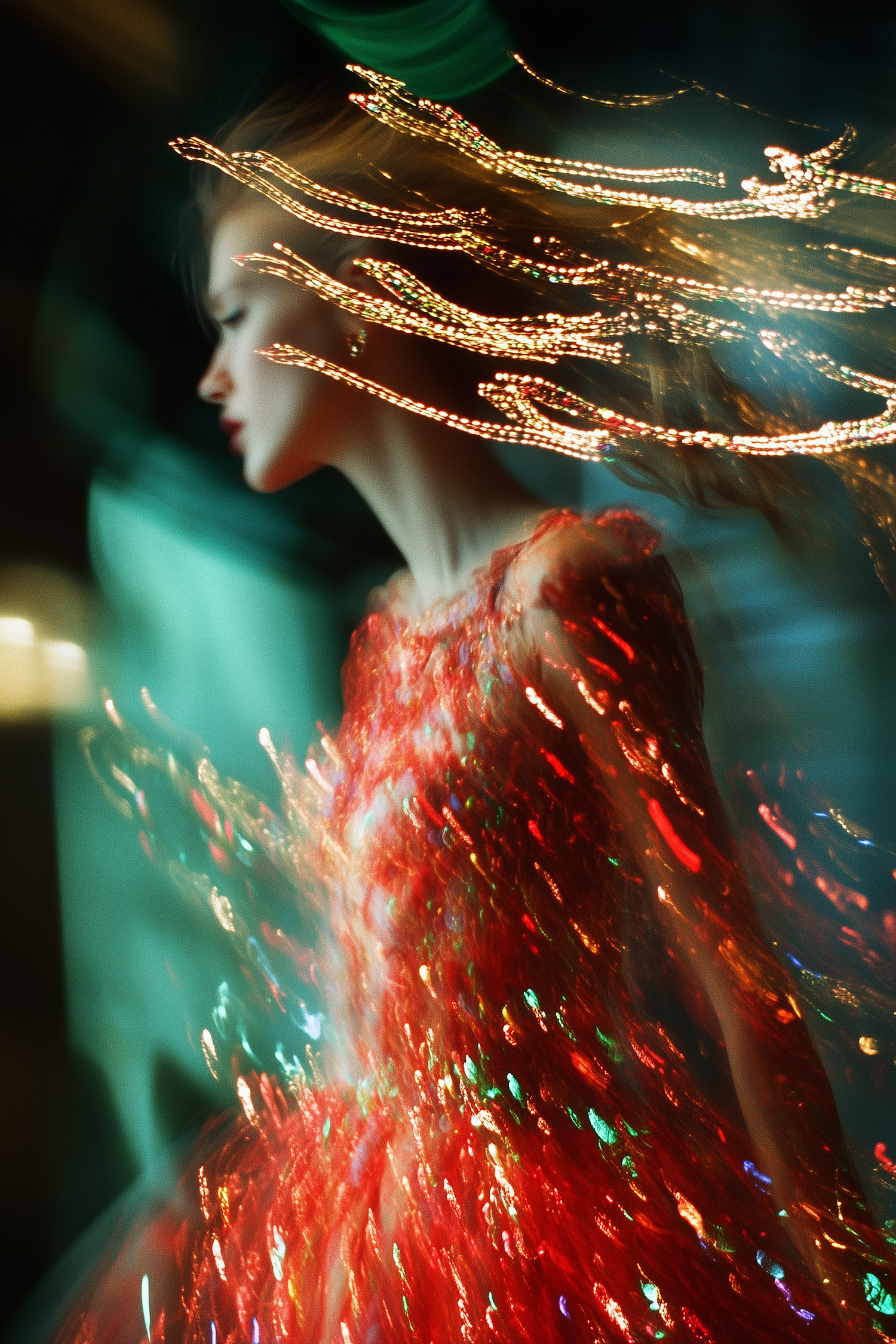 Ethereal image of a woman in a sparkling red dress with dynamic light trails, creating a surreal and dreamlike atmosphere.