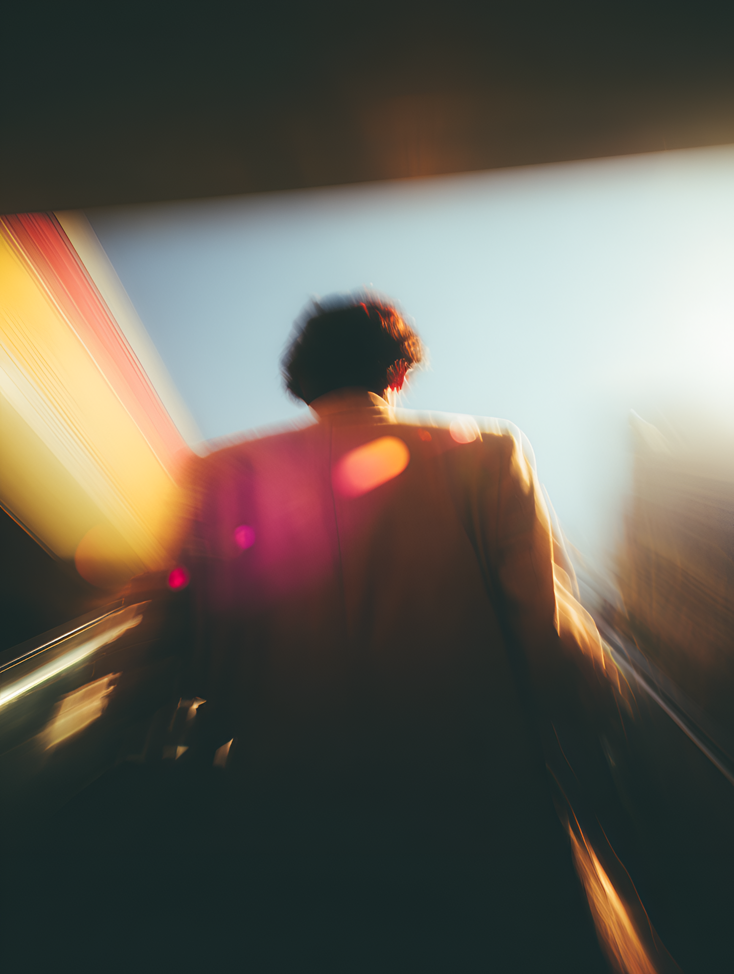 A dynamic shot of a person on an escalator with vibrant light streaks and a dreamy, blurred effect, evoking motion and energy.