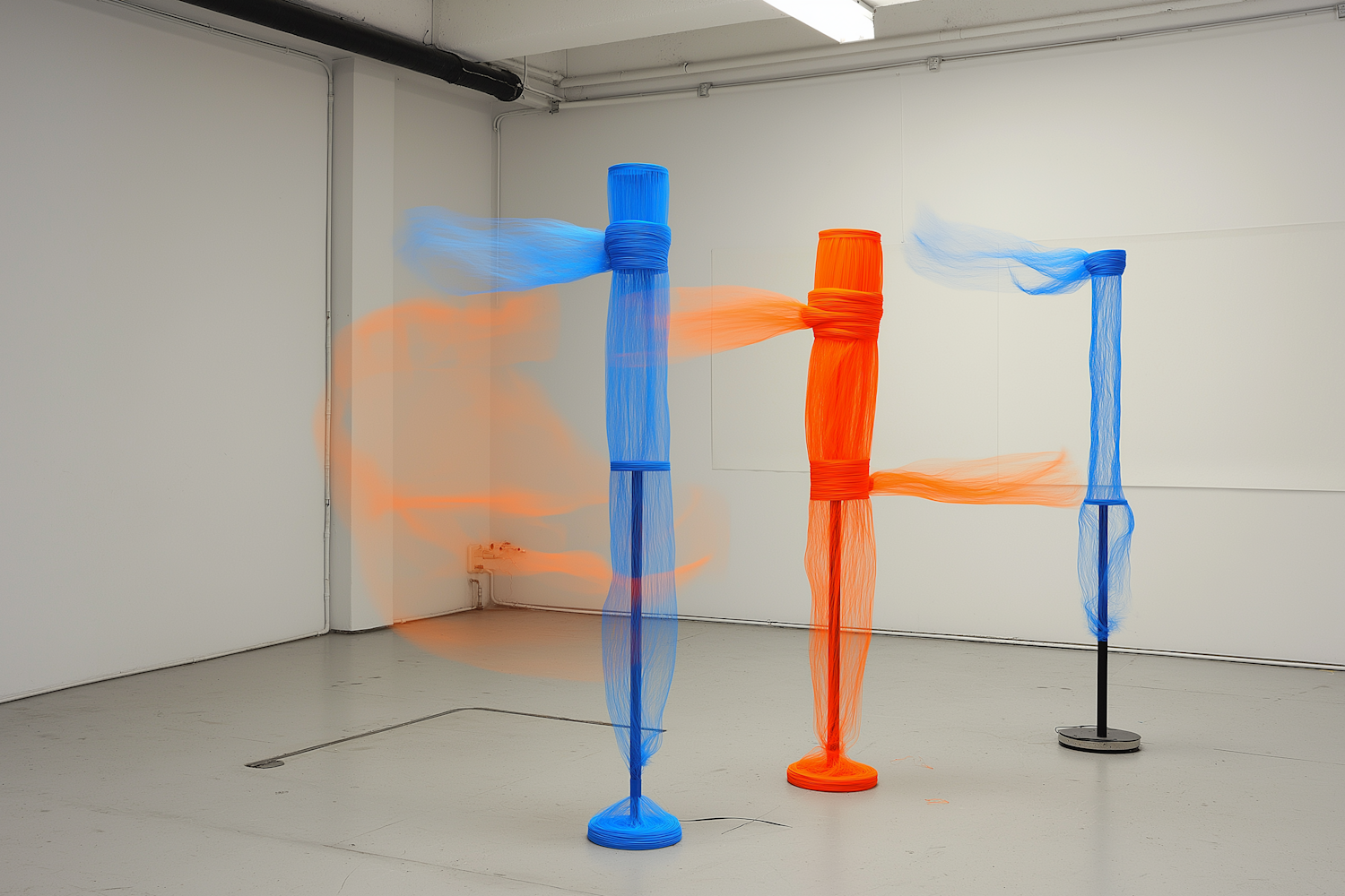 Dynamic art installation with flowing blue and orange fabric on poles in a minimalist gallery space. Vibrant colors and motion effects.