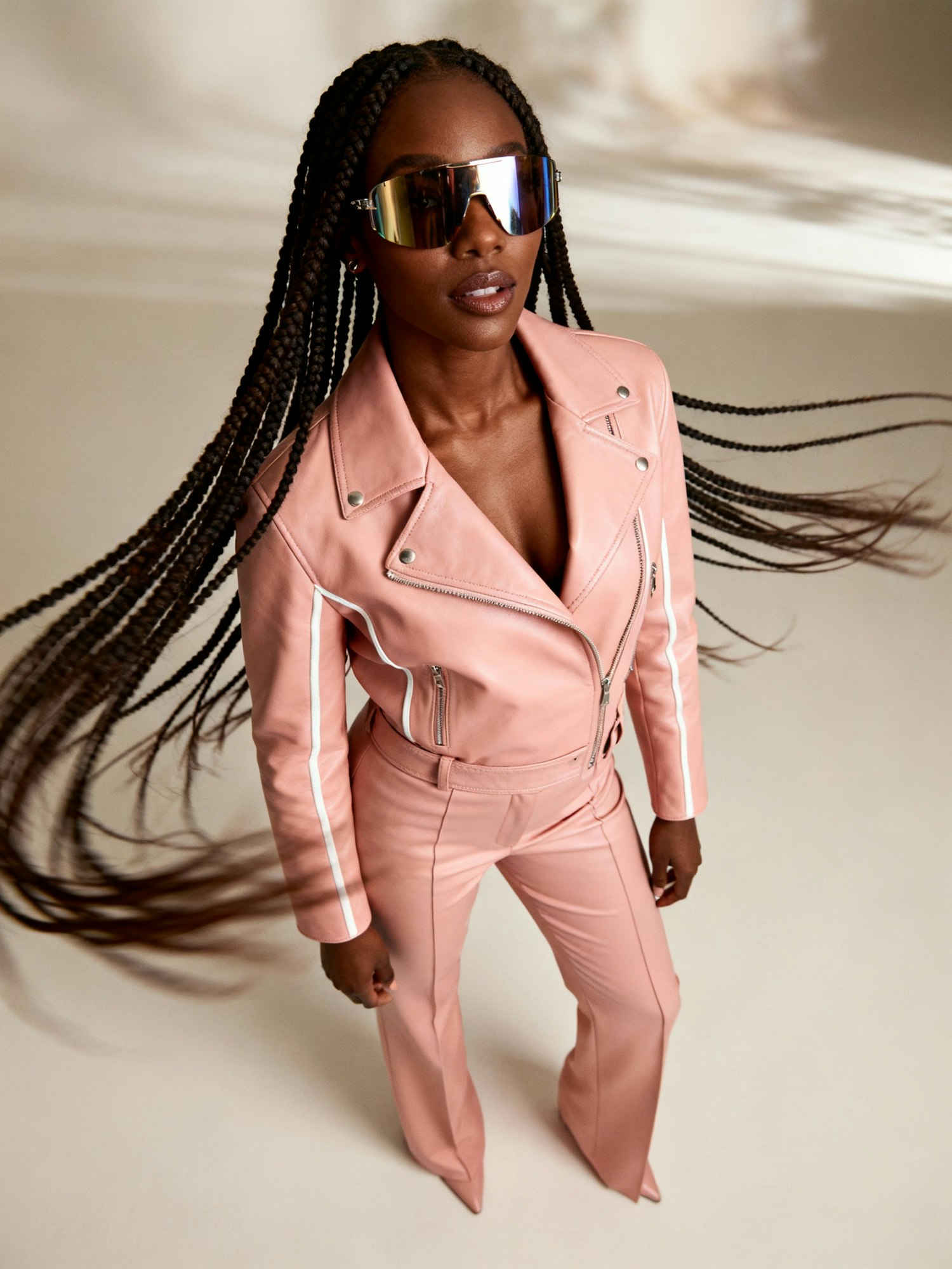 High-definition, cinematic full-body portrait of a stylish Black woman in a sleek baby-pink leather jacket with subtle white accents and tailored pants that fully cover her legs. She wears sunglasses and her long braids flow dramatically, captured in blurred motion to convey speed and dynamic energy. Soft, directional lighting accentuates the textures of the jacket, the shimmer of the sunglasses, her glowing skin, and the motion of the braids. She poses confidently, posture relaxed yet commanding, exuding modern, edgy style. Fashion-forward, elegant, and visually striking—perfect for a high-fashion editorial portrait with a sense of movement and vitality.
