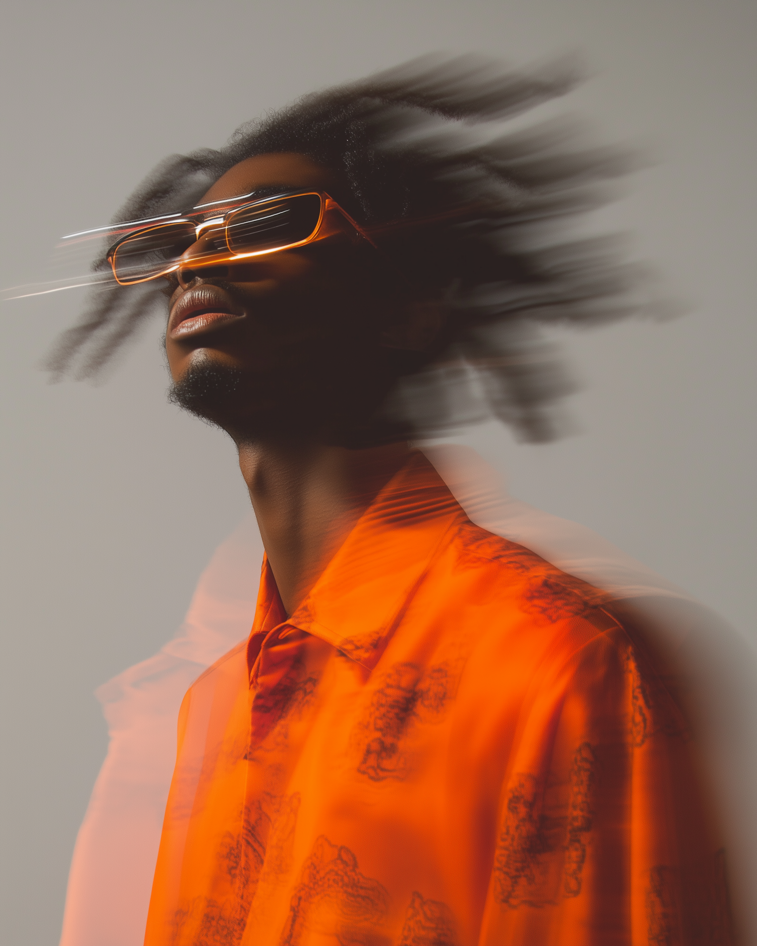 Dynamic portrait of a man in orange sunglasses and shirt, with blurred motion effect and textured locks, set against a gray background.