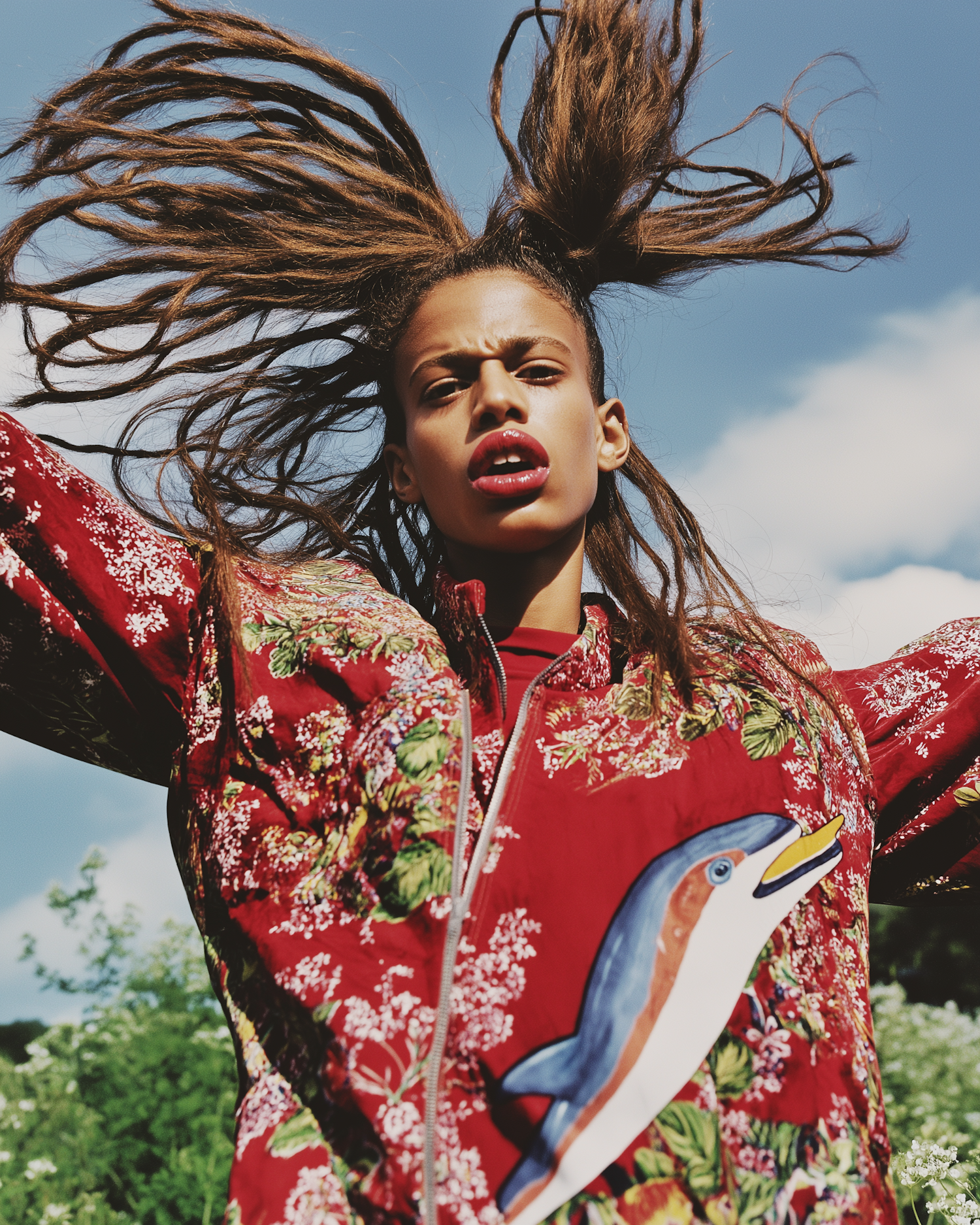 Dynamic portrait of a woman with flowing dreadlocks, wearing a red floral jacket with a dolphin graphic, set against a clear blue sky.