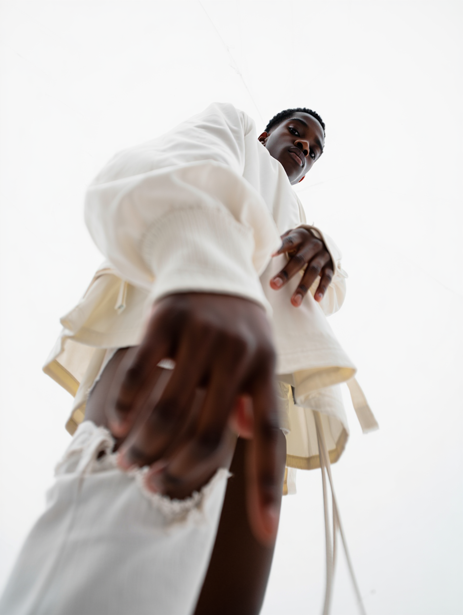 Low-angle shot of a man in a layered off-white outfit, reaching toward the camera against a bright white background.