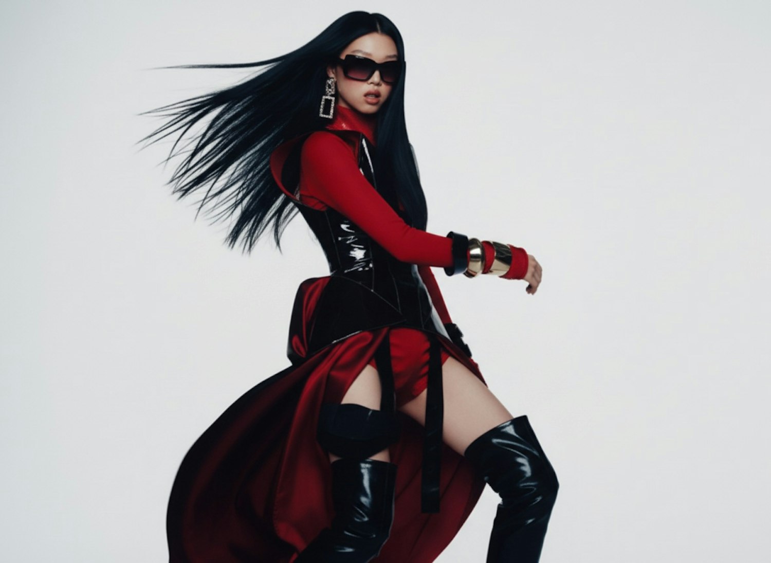 A dynamic fashion shot featuring a bold red and black outfit with sleek accessories, showcasing modern style and movement.