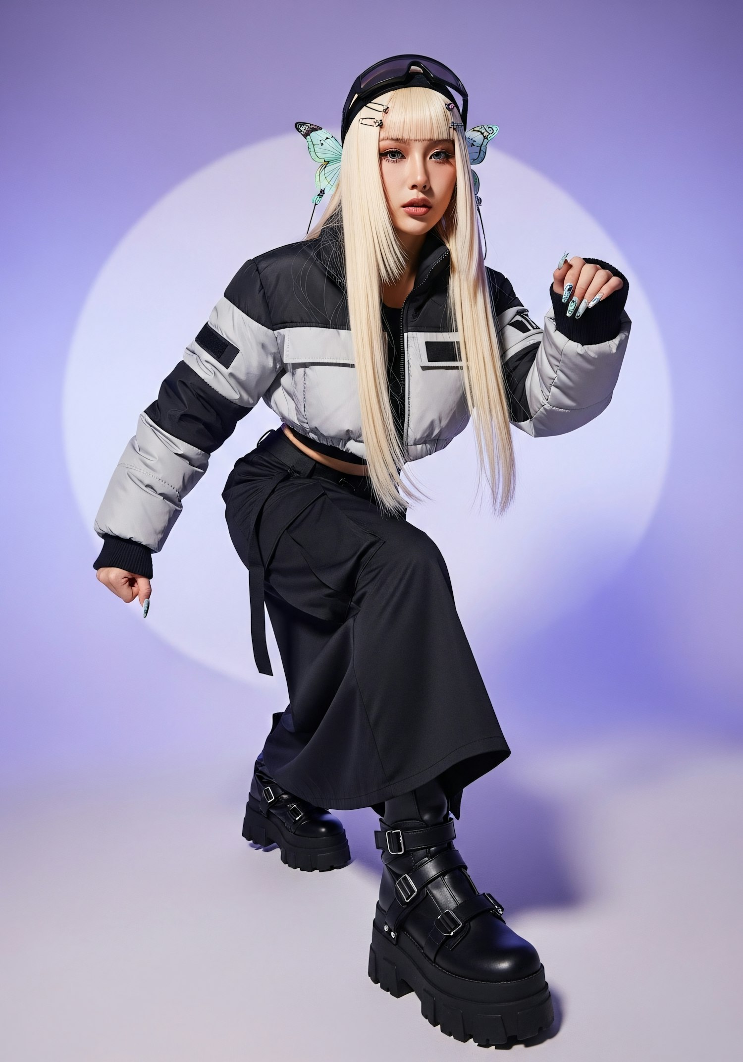 A stylish individual in a cropped jacket and platform boots poses dynamically against a purple backdrop, showcasing bold fashion and accessories.