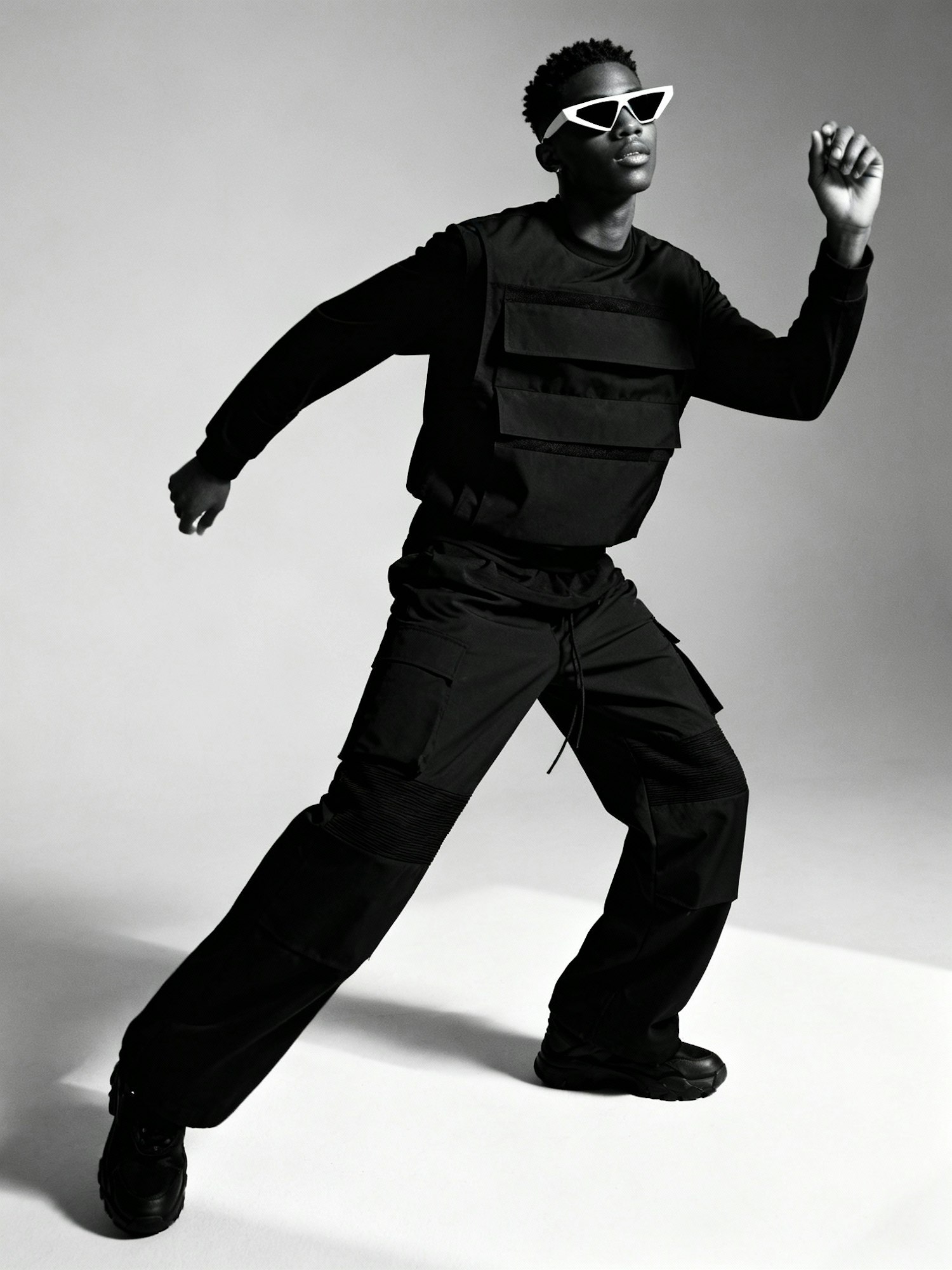 Full-body, ultra-high-definition black-and-white portrait of a stylish individual mid-motion, captured in a dynamic pose that conveys energy and confidence. They wear a sleek black outfit with layered textures and bold sunglasses, their silhouette sharply defined against a minimalist, light-toned studio backdrop. The lighting is directional and soft, casting sculptural highlights across their skin and garment, emphasizing movement and form. The composition is editorially sharp and stripped of distraction, blending streetwear realism with a futuristic edge. The overall mood is modern, modest, and visually striking—ideal for a Gen Z fashion portrait or Afro-fusion identity showcase rooted in motion and clarity.