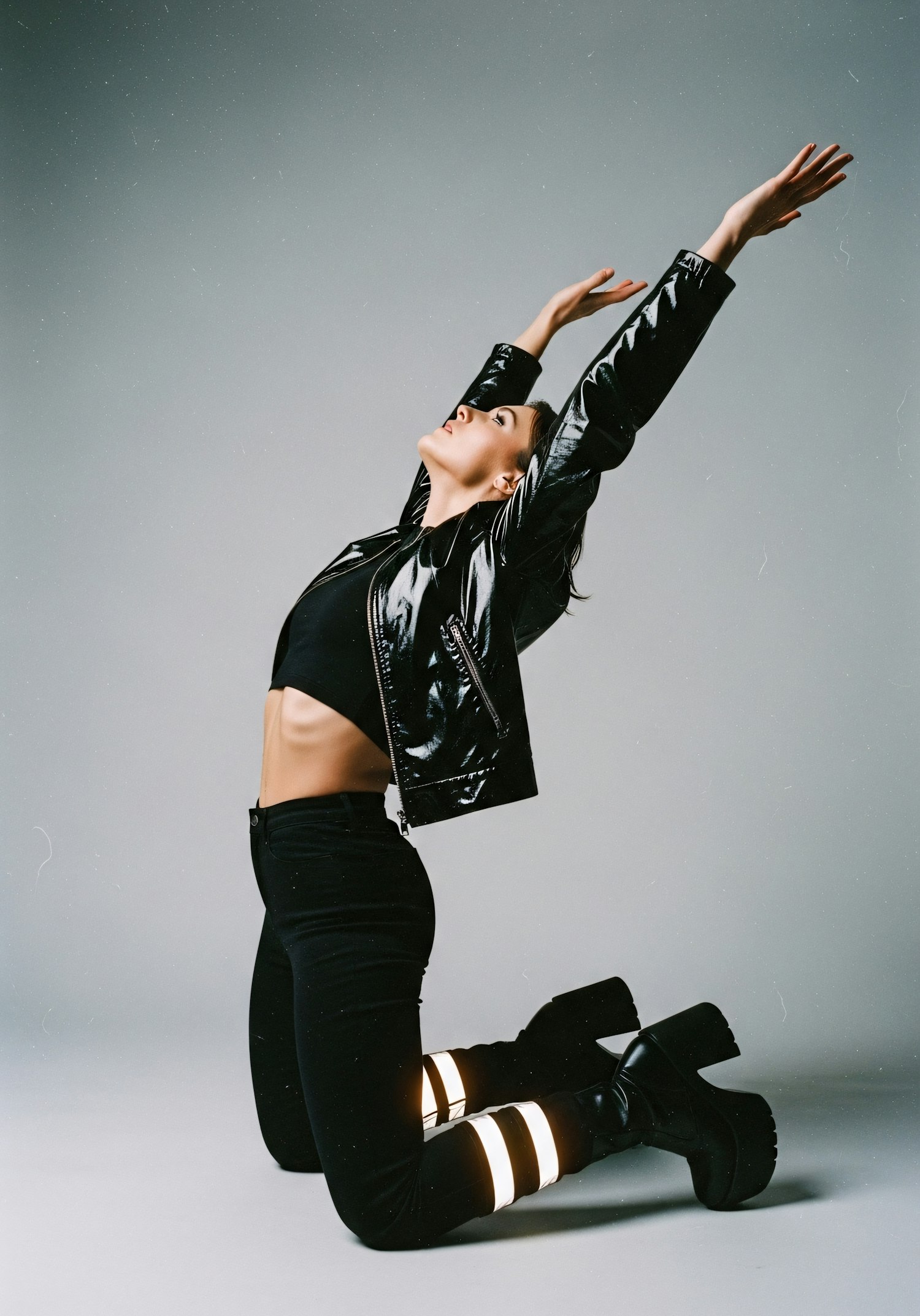 A person kneels with arms raised, wearing a shiny black jacket, reflective pants, and platform boots, set against a neutral background.